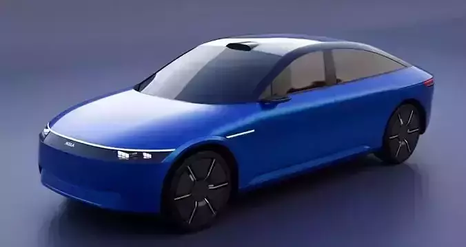This image showcases a modern and sleek electric sedan concept in a vibrant blue color, presented from an elevated front-quarter perspective. The car features an aerodynamic, minimalist design with a smooth, continuous body line, dark tinted windows, and covered wheels that hint at efficiency. A subtle light strip runs across the front, serving as the main headlight element, contributing to its futuristic aesthetic. The vehicle is set against a complementary muted blue background, emphasizing its contemporary and forward-thinking design.