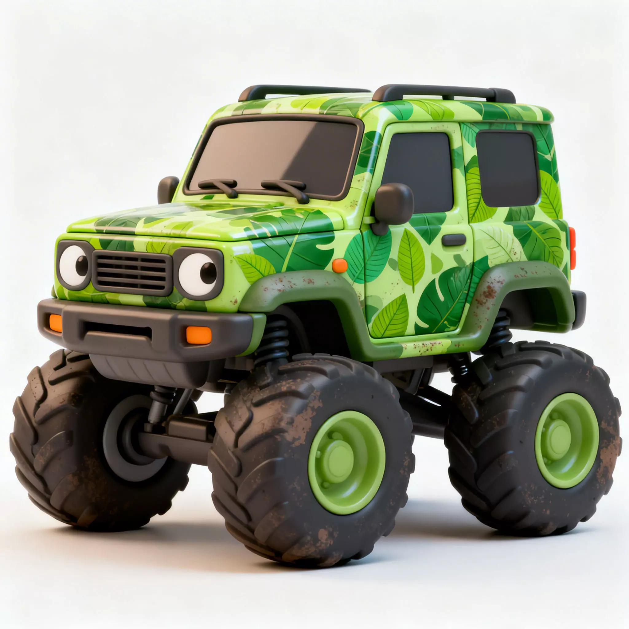 Aggressive Monster Tires: Equipped with high-clearance, oversized deep-tread tires featuring realistic mud accumulation and surface grime for an authentic off-road character.