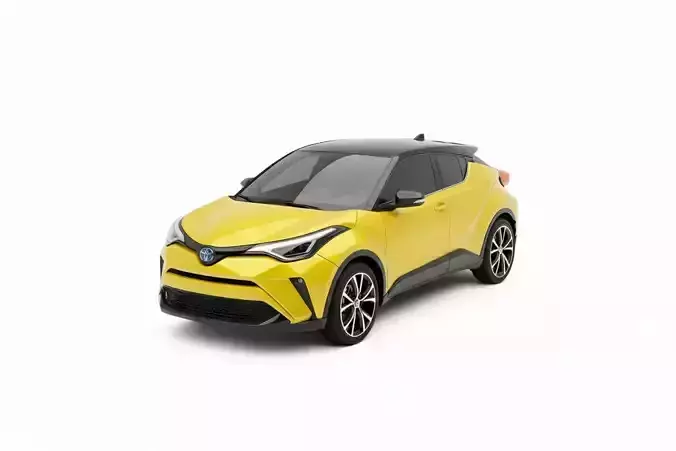 This is a highly accurate 3D model of a modern compact crossover SUV, exhibiting a recognizable design similar to the Toyota C-HR. The vehicle is painted in a striking, bright yellow finish that emphasizes its aggressive, angular styling. It features a fashionable two-tone color scheme, with the roof, pillars, and some lower body cladding rendered in gloss black. The model includes detailed features such as sharp, slender headlights, a pronounced front grille, and detailed alloy wheels. This asset is ideal for architectural visualizations, virtual automotive showrooms, urban environment scenes, or use in car configurator applications.