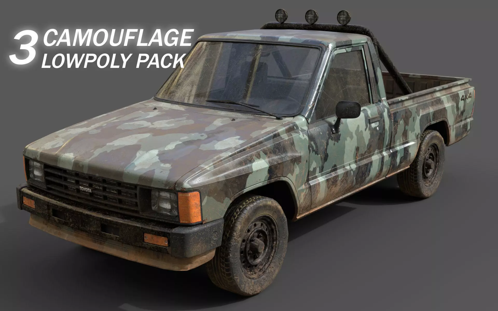 This a Lowpoly model ready for put in any game engine like UE4, Unity3d, CryEngine, or even make nice renders with any Render engine like V-ray, Corona, Keyshot, etc, the renders of the presentation were made using iRay so the PBR texture will work fine in any other render engine, The package includes:1 FBX File1 OBJ File1 Max File (Version 2014)3 Package of PBR texture which includes Diffuse, Normal, Metalness, Roughness, AO, Opacity (each texture folder has different pbr material accordingly to the Camouflage version of the car)each texture has a resolution of 4096x4096 but they can easily reduced down to 2k and the model will still look fine