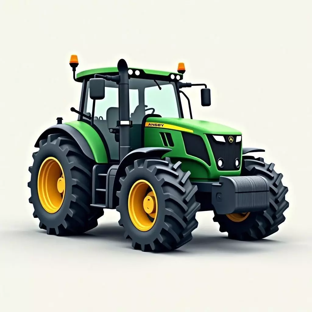 A stylized 3D model of a modern agricultural tractor, featuring a vibrant green body with bright yellow wheels and accents. The tractor has oversized, knobby tires, a spacious cabin with large windows, and visible details like headlights, exhaust pipe, and warning lights. The design has a slightly cartoonish or simplified aesthetic with smooth surfaces and clear shapes, making it appealing for a younger audience or casual game environments. The model is presented against a plain white background, emphasizing its cheerful and approachable design. This model is ideal for children's educational content, casual farming games, or stylized agricultural visualizations.