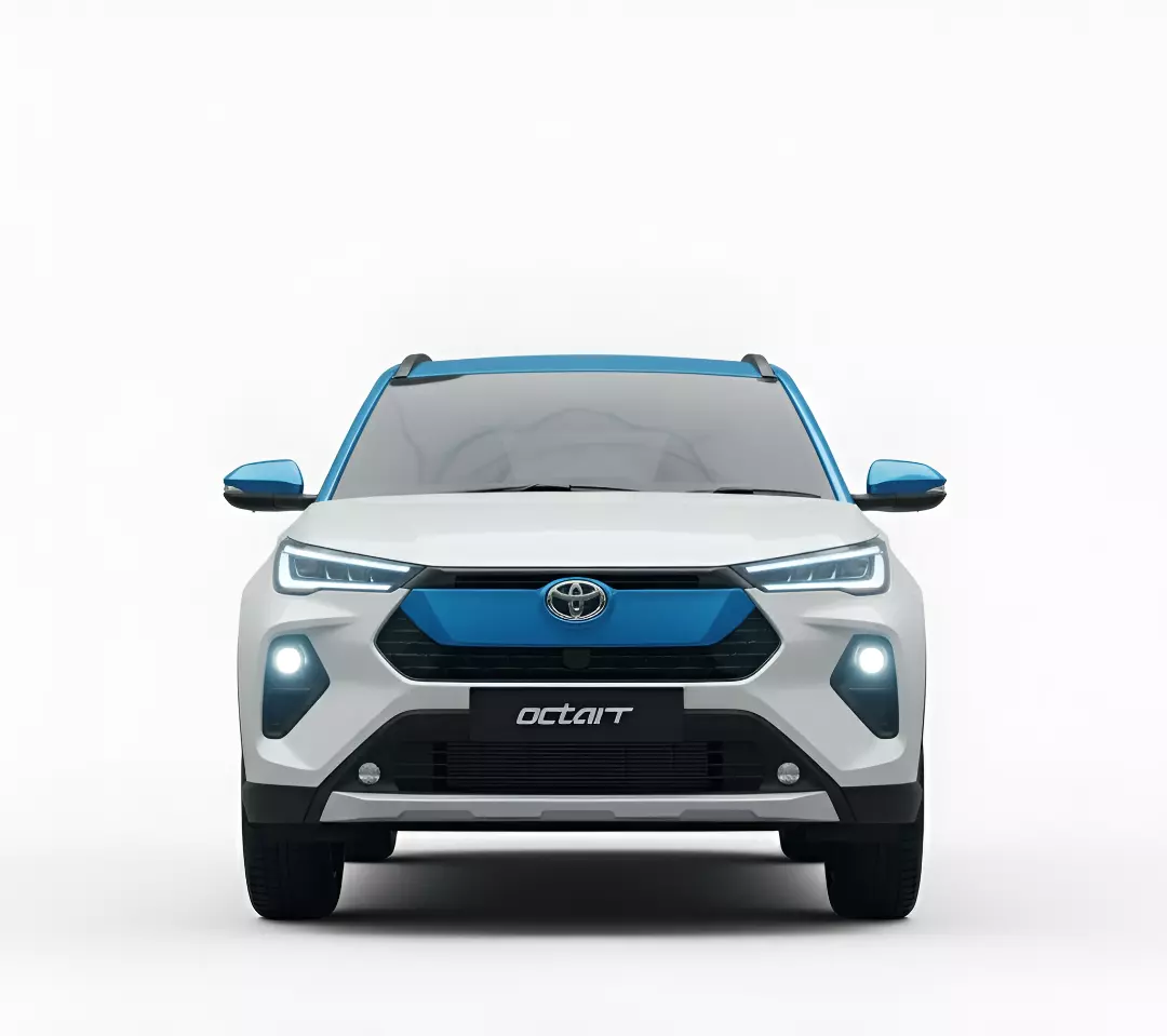 This is a high-quality 3D render of a modern, compact crossover SUV, presented in a striking two-tone color scheme: white for the main body and a contrasting bright blue for the roof, mirror caps, and grille accent. The front fascia features a contemporary design with slim, horizontal LED headlights and large, circular fog lamps. A logo, resembling that of Toyota, is prominently placed on the blue-accented grille, which also features the hypothetical model name OCTANT below it. The overall design emphasizes a rugged yet urban aesthetic, characterized by plastic cladding along the wheel arches and lower body. The blue accents strongly suggest this model is an electric (EV) or hybrid vehicle concept, aligning with the current trend toward electrified compact utility vehicles.
