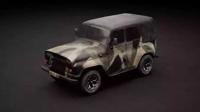 Low-poly 3D model of the UAZ-469. Metallic-Roughness textures atlas - 4096/4096 . Model separates by 2 materials with separate UV sets (base and wheel). Polygons- 12401 Vertices- 13094 Metallic Roughness textures - 4096/4096