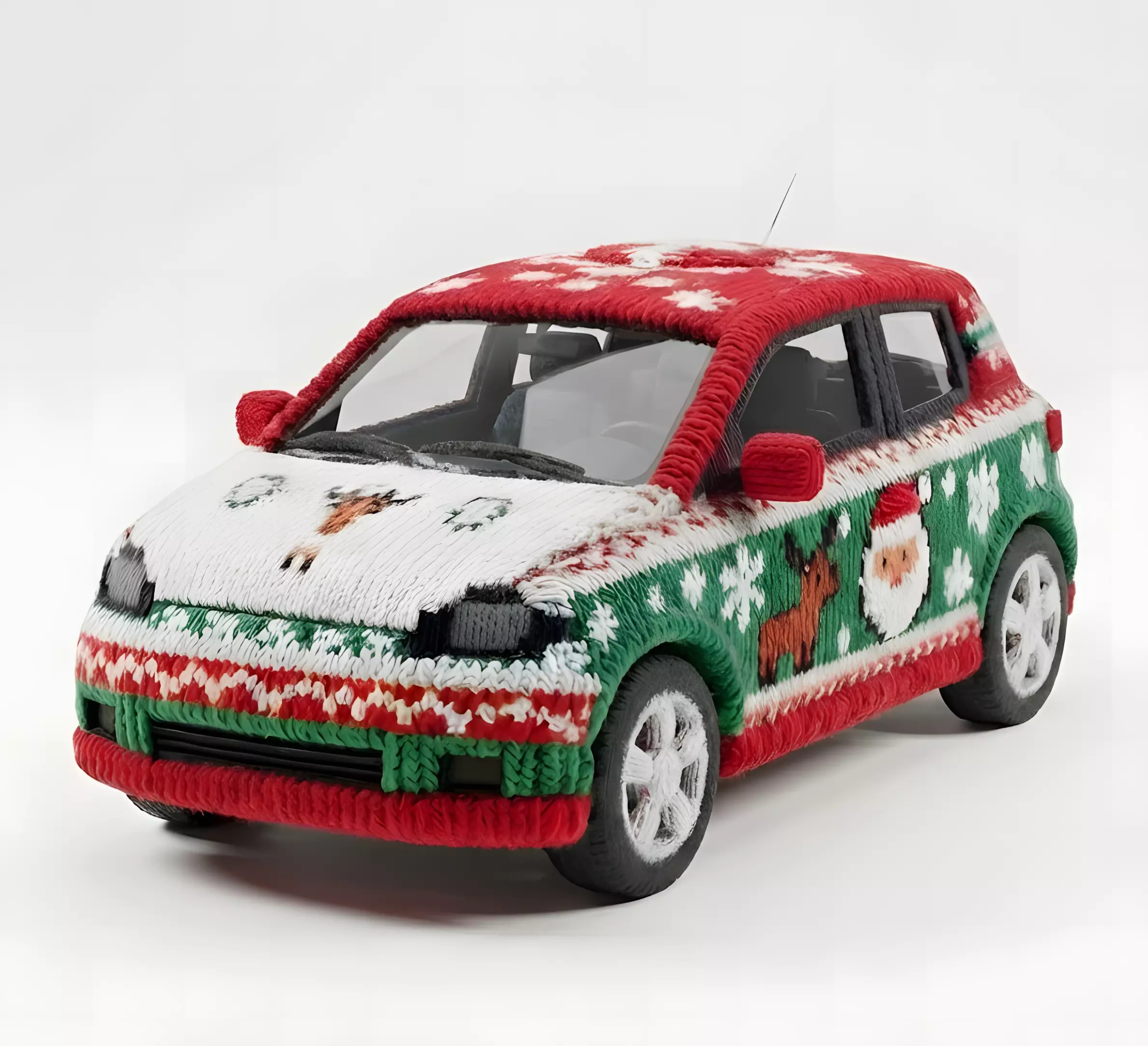The Overall Concept This asset is a hilarious and unique twist on a standard vehicle. It is a compact hatchback car that has been completely yarn-bombed, wrapped in a thick knitted cover that looks exactly like an ugly Christmas sweater.