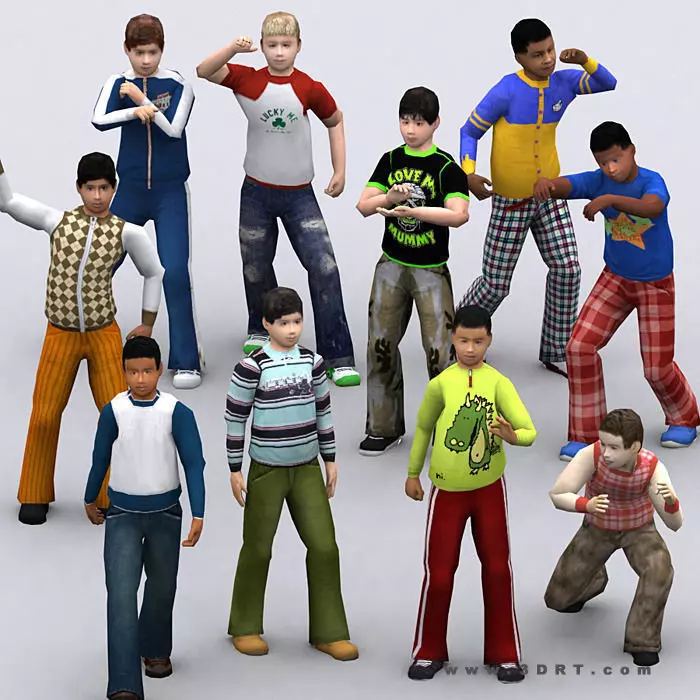 3D realpeople kids boys collection. body mesh +10 skin textures. 2 LODs included Triangles count: High LOD 1930, Low LOD 642.