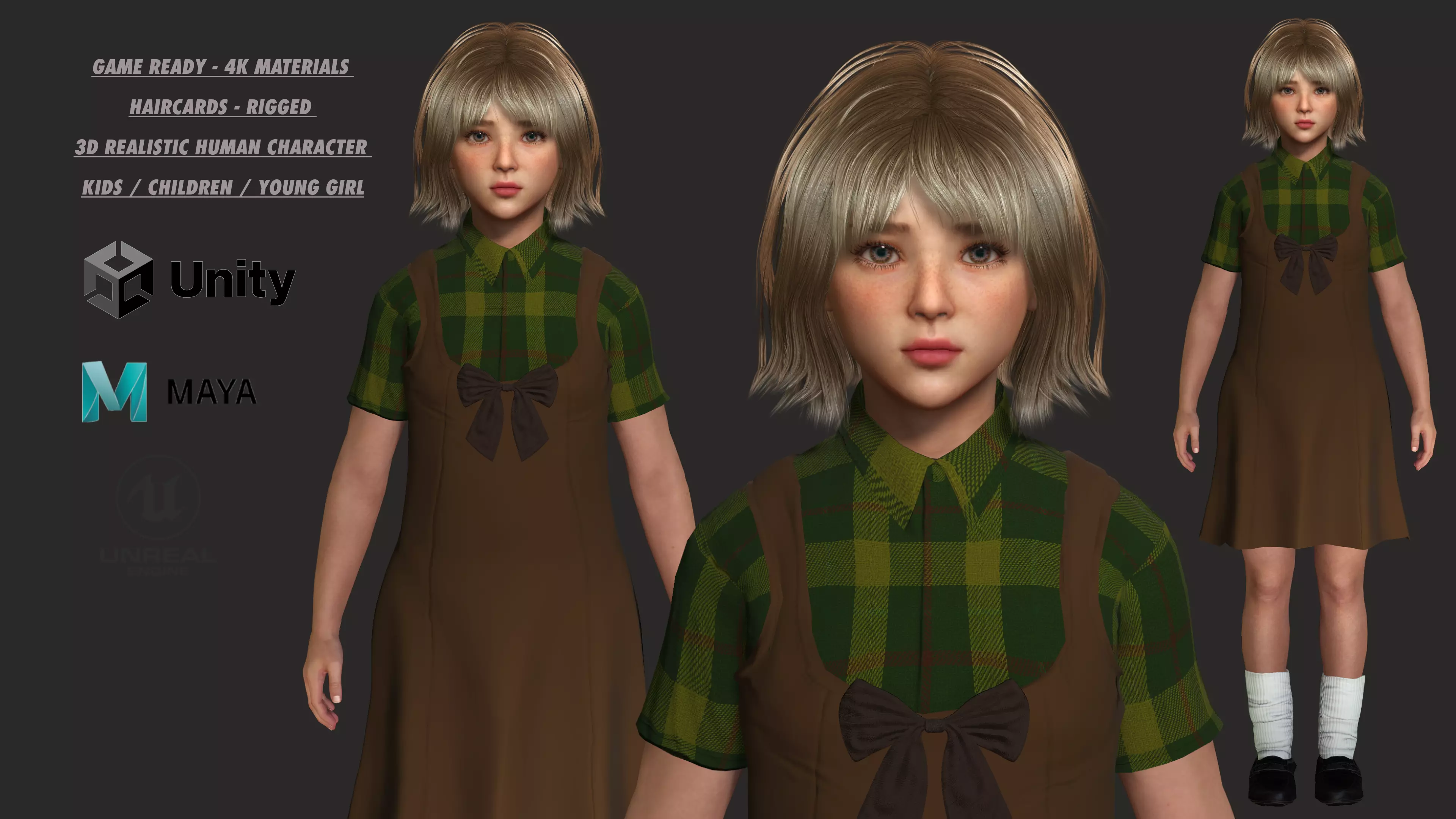 Realistic 3D character of European little girl wearing a brown school outfit / Casual outfit. Game-ready with 4K PBR textures, clean topology, and detailed realism — perfect for Animation, Games, AR / VR Project, cinematic projects ,Educational Project or Youtube content.