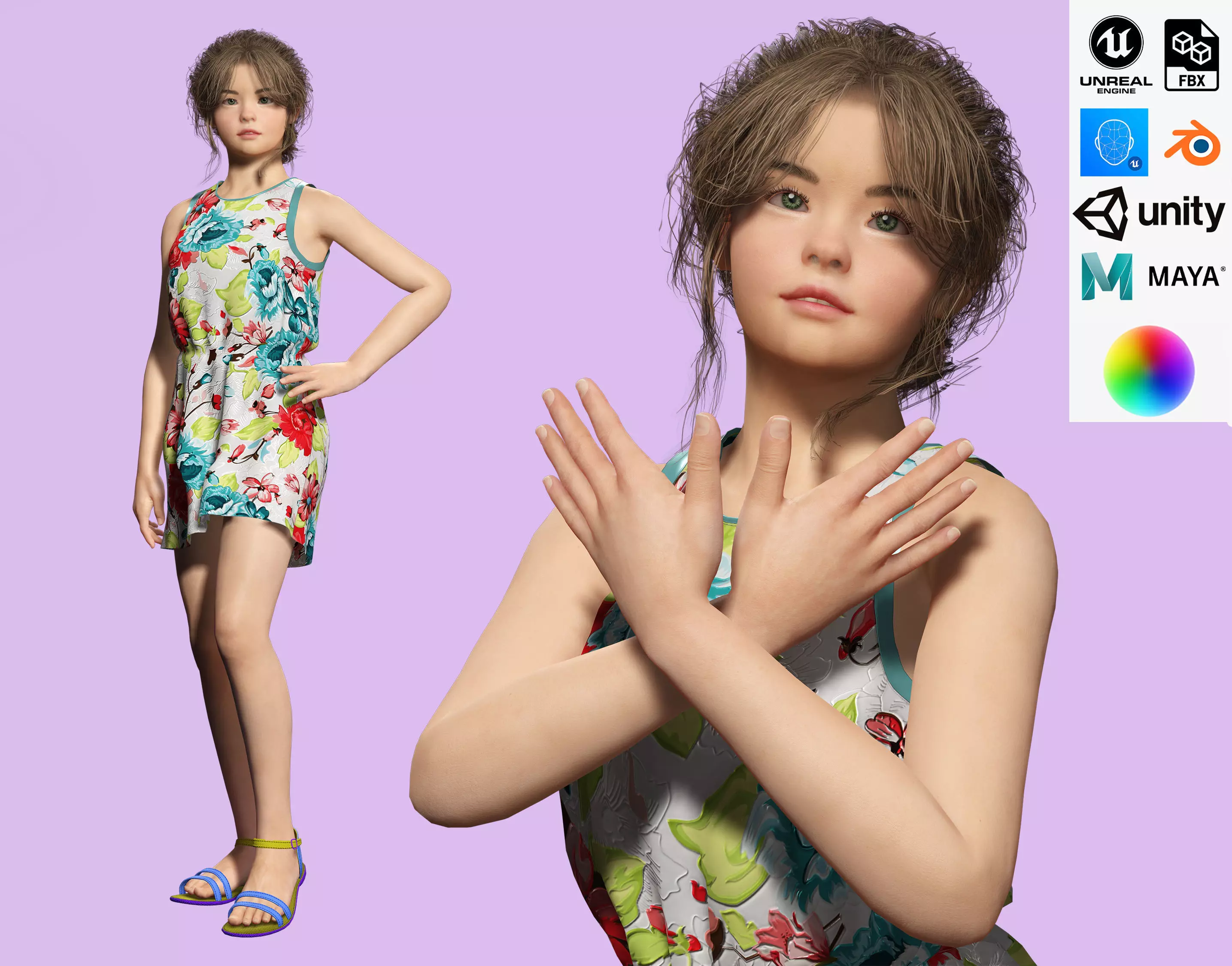 The model is fully customizable, with modular materials that can be adjusted to your liking, including settings for base color, AO, blend, displacement, glow, metallic, UV, normal, opacity, ORM, roughness, and specular. With more than six materials, including those for the eyes, nails, arms, and body, you have complete control over the look and feel of your character.