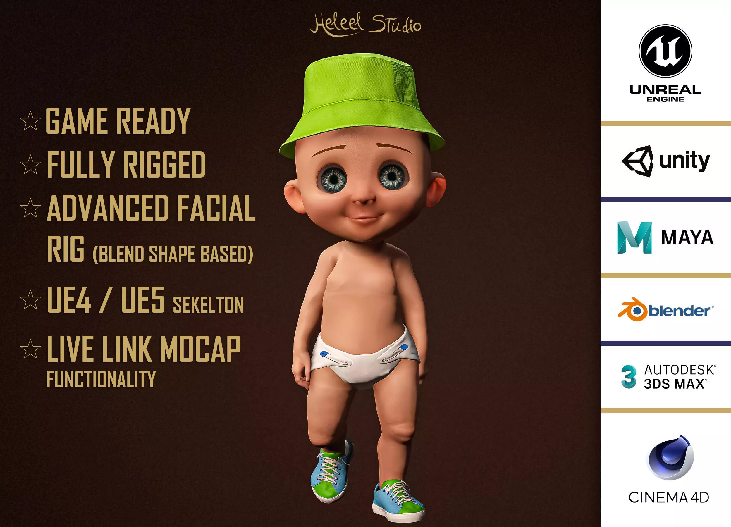 • C4D FBX (Contains body skeleton, expression blendshapes and embeds texutres)