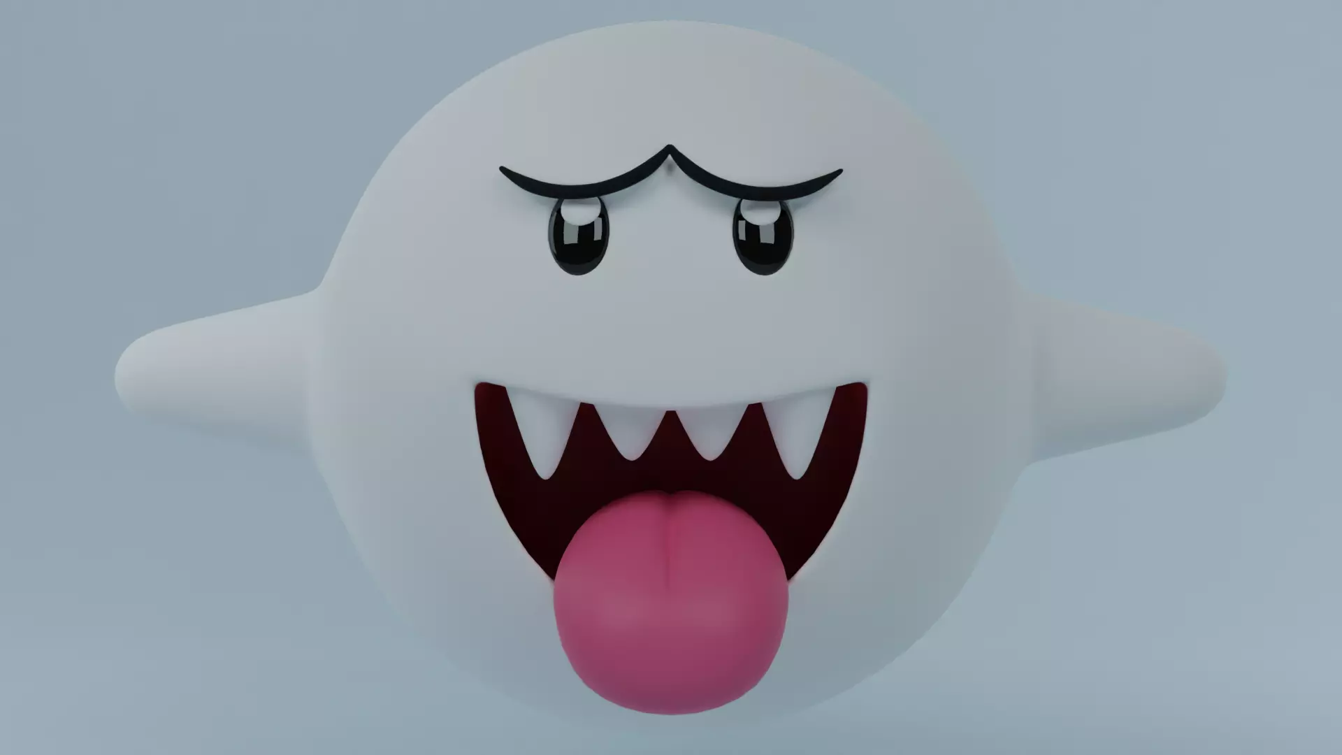 Este es un modelo del típico fantasma de Mario, un Boo. Su primera aparición fue en Super Mario World.Este modelo está hecho para una impresión 3D, no estpa riggeado, sin embargo lo puede usar como uster quiera.