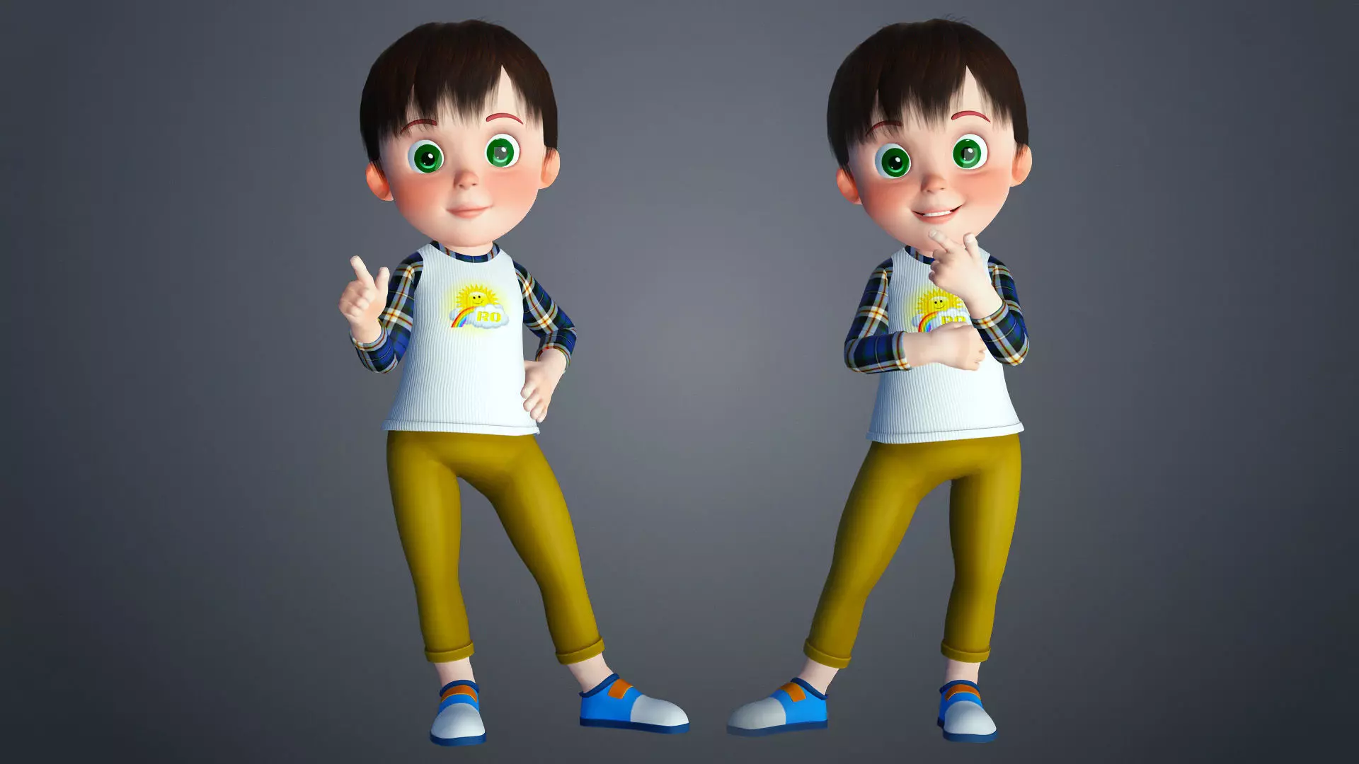 Get the most Stylish Cartoon Baby Rigged Character 3D model with colorful clothes, shoes, eyes that make it better than any available toon character on the internet. Here we provide you the biggest toon baby eyes, nice hair and colorful and stylish shirt, pant and shoes with only one texture that reduce size. Use the FBX, OBJ, Ma and MB with the Textures that you need for your own software that you use. You can use it into your multiple animation series and here you can use this 3D model into your high poly and low poly both projects.