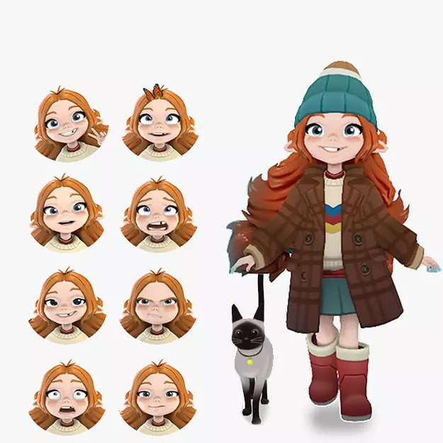 Rigged game-ready cartoon The Time Traveler character Face rig included.Software used Maya rendered with Arnold Included Software used Maya 2022*Formats mb, fbx, obj file poses for 3d print 2048x2048 TIF textures: Traveler_C, Traveler_CoatCap_C, Cat_C