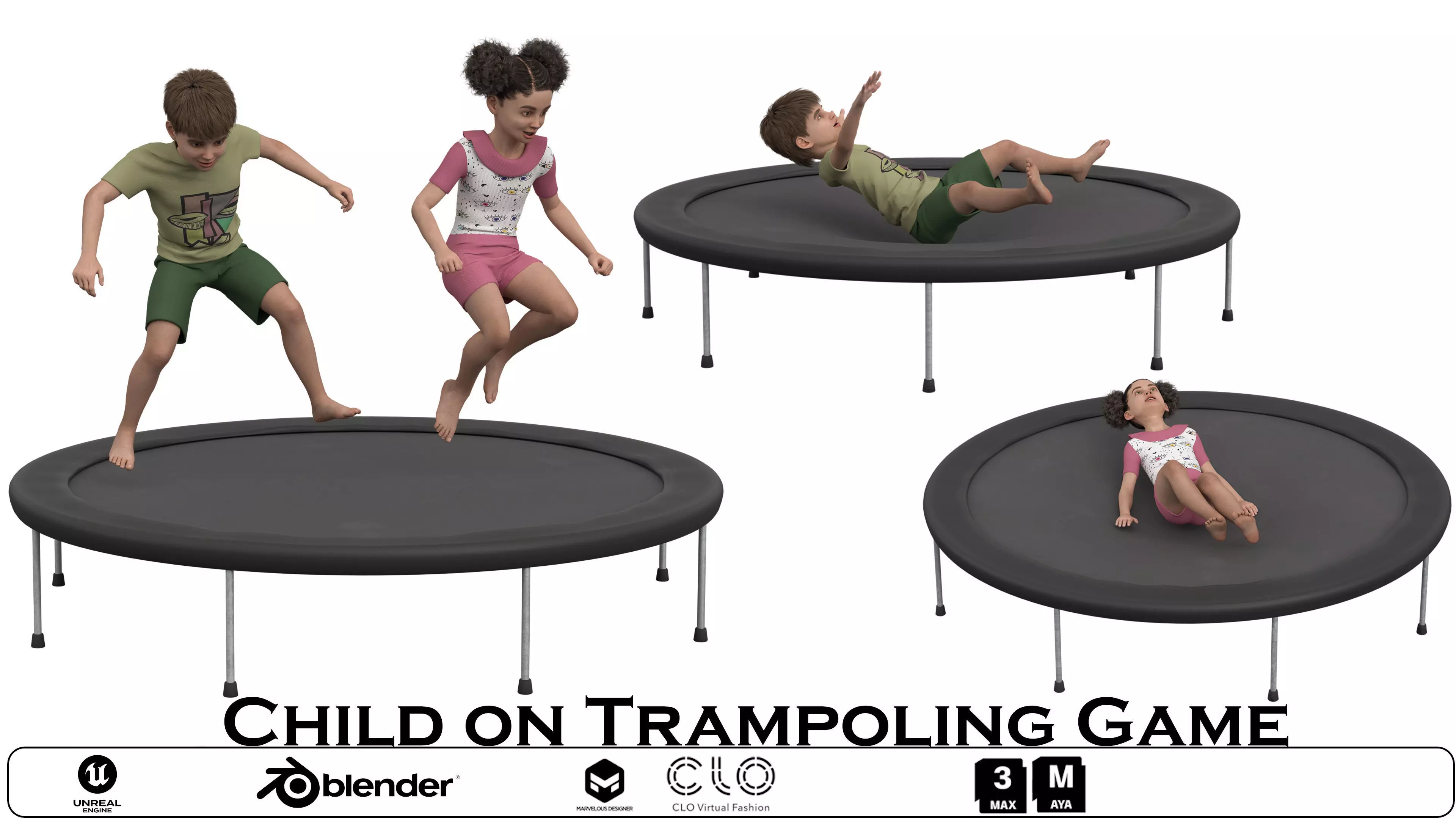 Playful Design: Characters are dressed in casual, colorful outfits, capturing the joy and excitement of children playing on a trampoline.Dynamic Poses: Each character is presented in a unique pose—jumping, lying on their stomach, and lying on their back—adding realism and movement to your scenes.High-Quality Detailing: Meticulously crafted to ensure realistic textures and refined details, from the fabric of the clothing to the facial expressions.Versatile Use: Ideal for animated films, game environments, virtual playgrounds, or family-themed 3D renderings.Optimized for Rendering: Compatible with Blender, Unreal Engine, Unity, and CLO Virtual Fashion for seamless integration into your workflow.