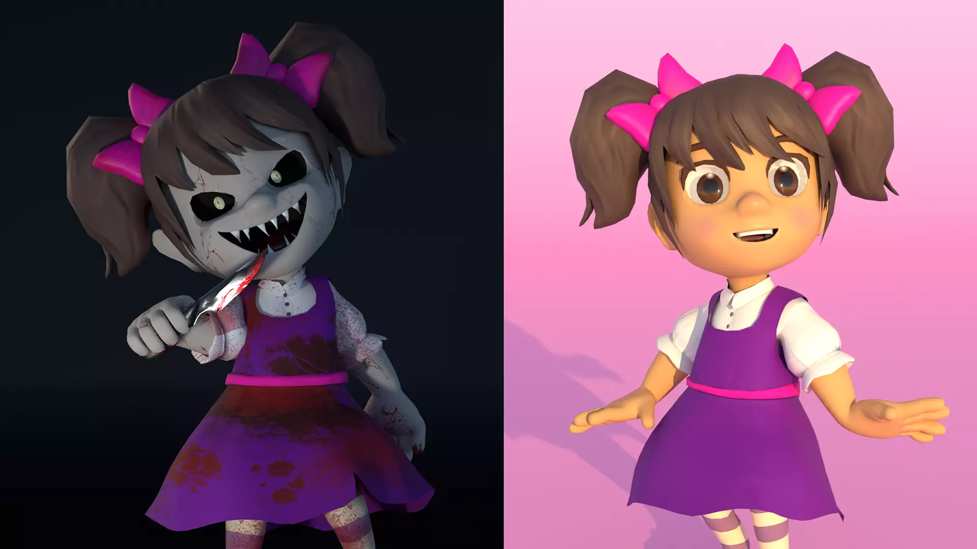 A stylized character pack built around contrast, mood, and storytelling.Meet two versions of the same girl — innocent and charming on the surface, unsettling and terrifying beneath. Switch between cute and creepy to instantly change the tone of your scene, from lighthearted adventure to dark horror.