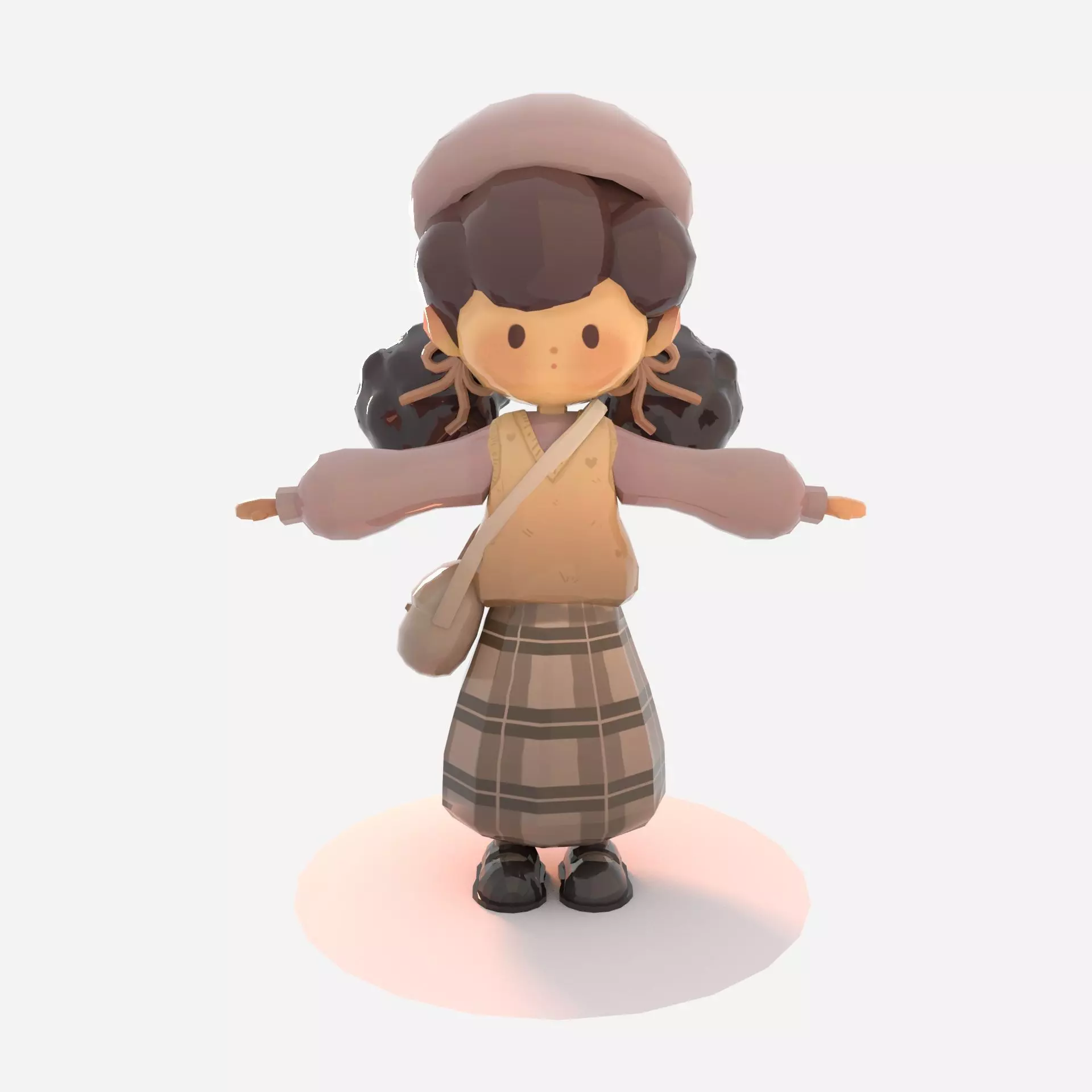 This is a low poly 3D model designed for video games. It features a charming chibi girl with customizable curly or shrt hair, a crossed body bag and beret hat. It comes to life with its hand-painted textures that add depth and detail to the character.