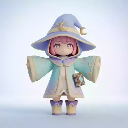 A stylized 3D cute fantasy mage designed for family-friendly and fantasy games.The character is a child mage girl in chibi style, presented in T-Pose and front view, full body. She features oversized robe sleeves, holds a small magic book, and uses pastel colors with soft lighting to create an adorable and magical appearance.