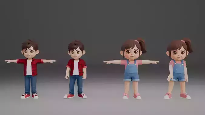 Cute Kids 3D Characters Pack – Boy & Girl | T-Pose + Rigged + Basic Animations | Cartoon Style