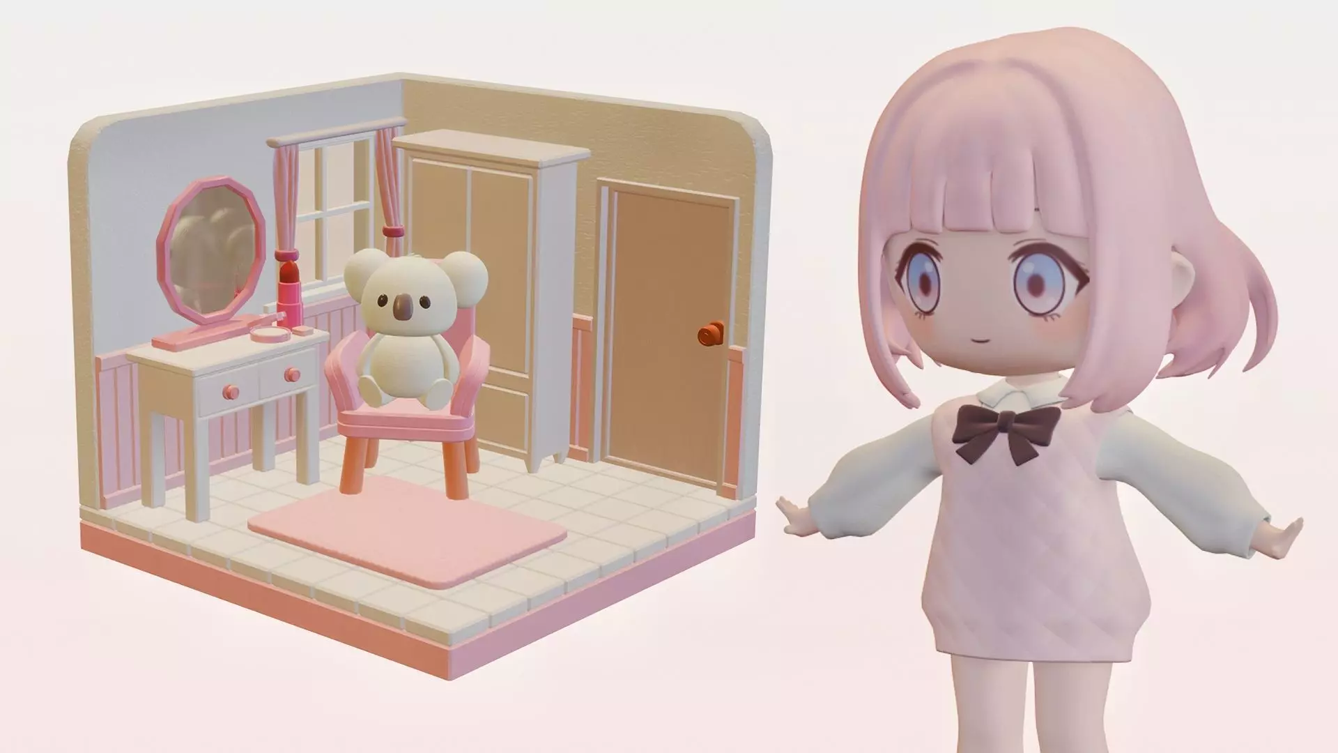 Overview:A charming, high-quality stylized 3D asset pack featuring a cute chibi-style girl, a cozy bedroom interior, and various props (flower vase, koala plushie). Perfect for game developers, animators, or anyone looking for a cozy/healing aesthetic.Features:Characters: 1 Stylized Little Girl (T-pose included).Room Environment: Modular walls, door, window, and floor.Furniture & Props: Wardrobe, vanity table with mirror, chair, koala plush toy, flower vase, and blooming flowers.Style: Clean low-poly topology with vibrant, candy-colored palette.Technical Specs:Software: Created in Blender.Materials: Simple stylized materials for easy customization.Note: Rigging is optimized for Blender. For other software, some adjustments may be needed.