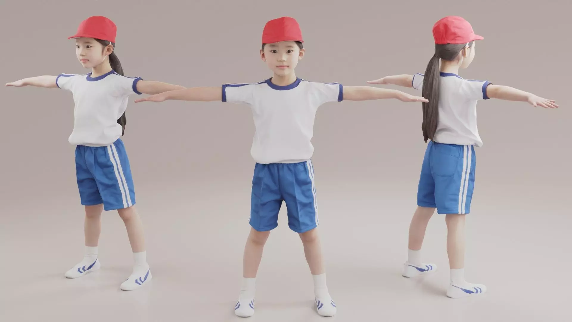 Japanese (Asian) elementary school students in gym clothes.This 3D model is made with photogrammetry.This is useful in architectural CG and metaverse.The mesh is around 20,000 polygons.A type with movable eyes and mouth is also included.
