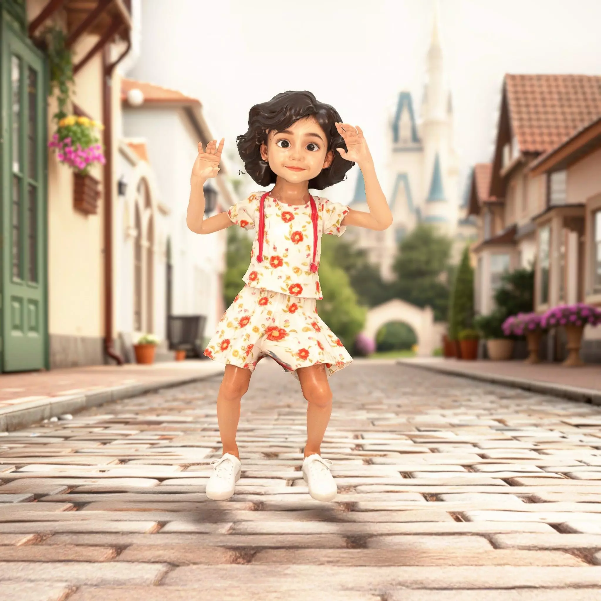 This charming character model features a young girl in a delightful floral outfit, perfect for animations and interactive applications.