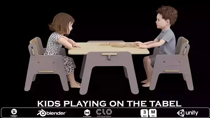 Name: kids playing on the tabelType: modelFormat: 3Ds Max 2013Export: FBX, OBJRender: VRay (5.x), Corona (6)Polys: 93371Verts: 124190Matclasses: Multimaterial,VRayMtl,CoronaMtlUnits: CentimetersDimension: 74.56 x 152.41 x 74.81Date: 2025.8.27This premium 3D model offers a highly realistic and detailed scene featuring a boy and a girl playing with blocks at a table. The character models are crafted with a lifelike quality, from their expressions and hair to their clothing. This versatile asset pack is perfect for adding a sense of life, warmth, and family to a wide range of professional applications, including architectural visualizations, cinematic renders, game development, and virtual reality (VR) projects. High-Quality Character Models: The package includes fully textured, photorealistic models of a boy and a girl. Their skin, hair, and clothing are rendered with meticulous detail, making them ideal for close-up shots and high-resolution renders.