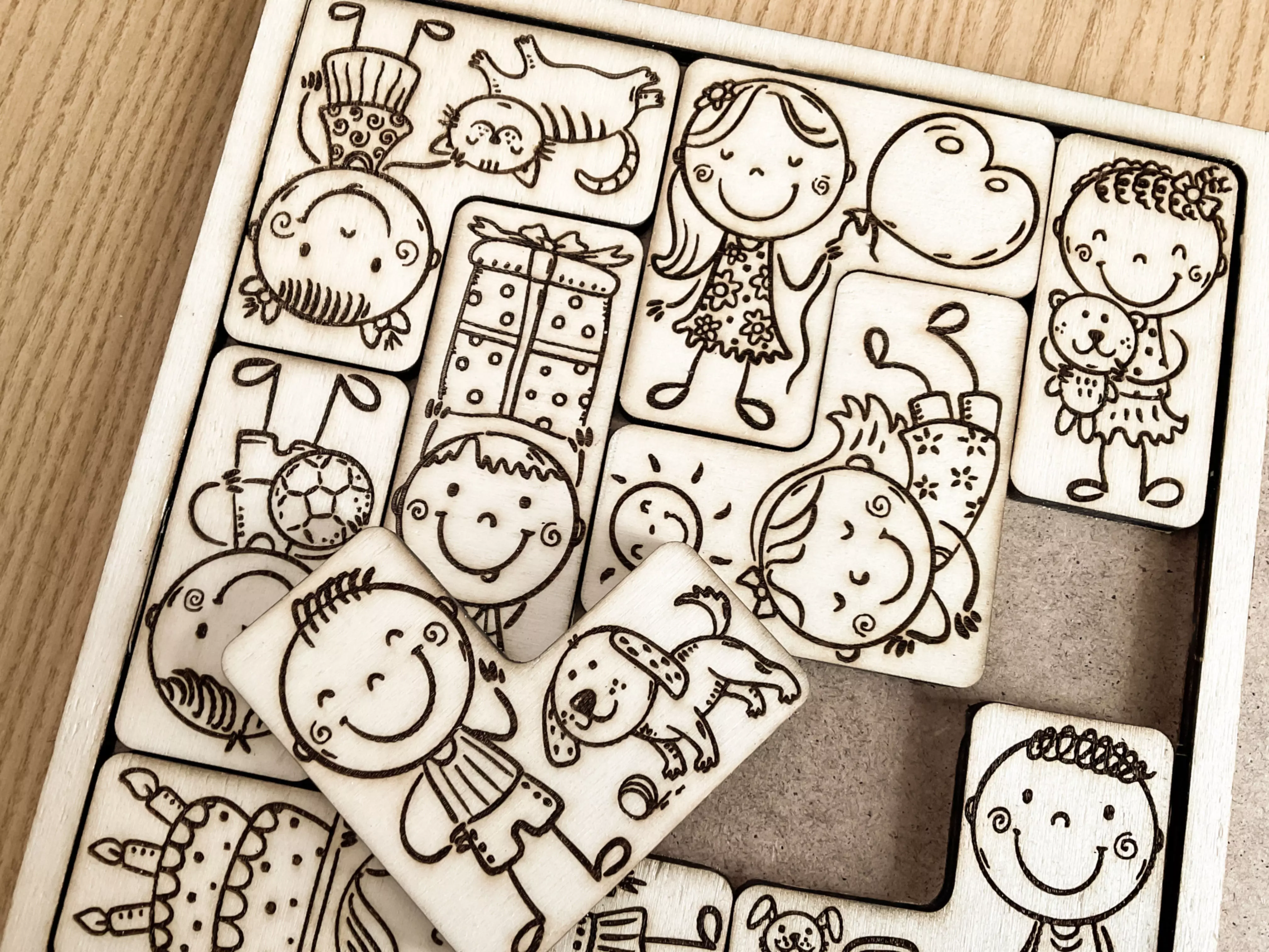 This adorable cartoon-style puzzle includes multiple cute child characters engraved in doodle style — perfect for laser cutting from wood or MDF. Kids can build the puzzle, color the pieces, and create fun storytelling games or imaginative play scenes.