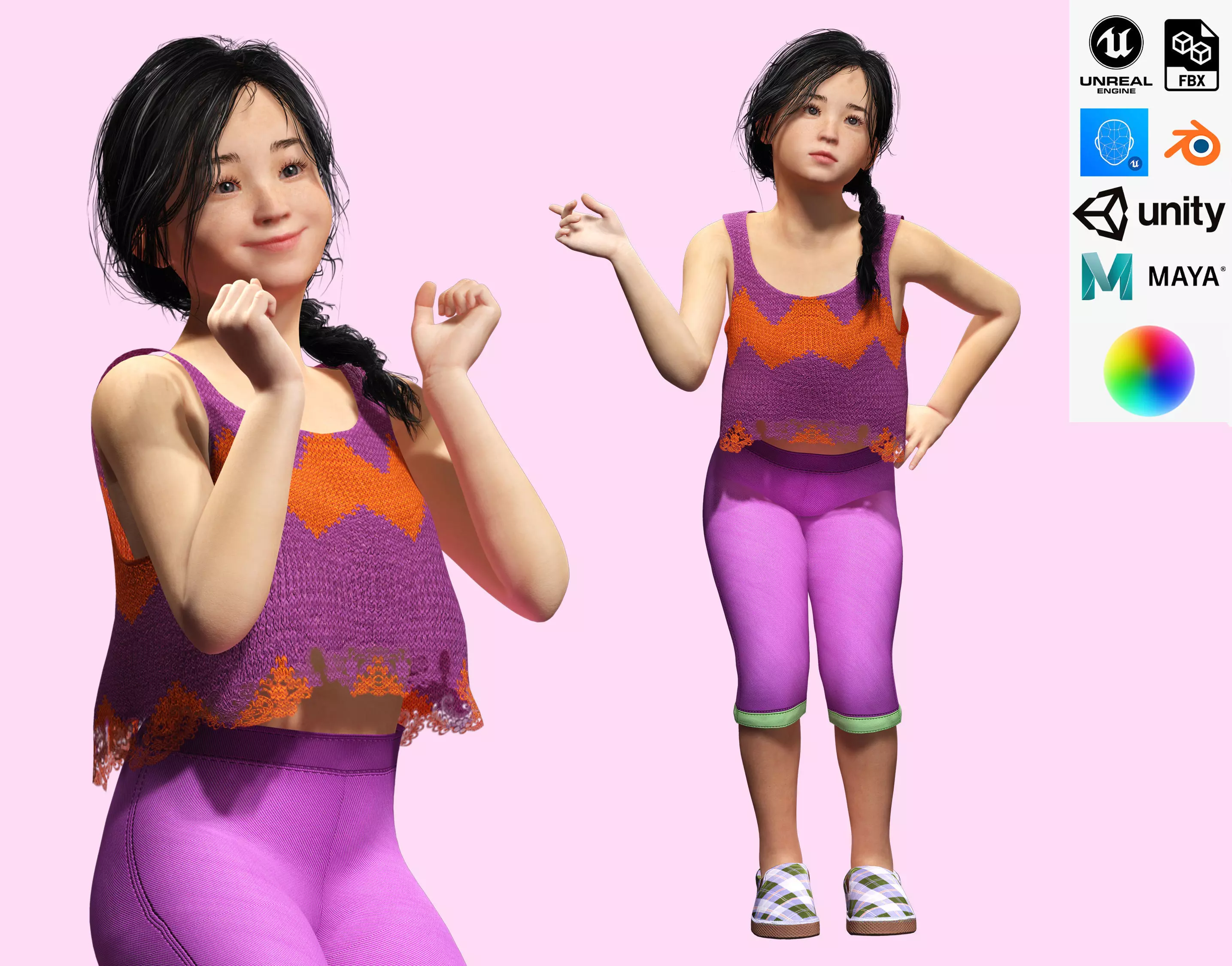 Introducing the perfect addition to your 3D asset collection - a stunning, fully rigged 3D model . This high-quality model is game-ready, low poly, and highly detailed, making it perfect for use in games, movies, animations, or as a base mesh for customization. One of the standout features of this model is the full facial rig, complete with over 125 morph controllers, including tongue, lips, brow, blink, nose, flank, cheek, mouth, and more. Additionally, the rig includes an advanced skeleton, making it an excellent choice for animators looking to practice their craft. The model is fully customizable, with modular materials that can be adjusted to your liking, including settings for base color, AO, blend, displacement, glow, metallic, UV, normal, opacity, ORM, roughness, and specular. With more than six materials, including those for the eyes, nails, arms, and body, you have complete control over the look and feel of your character. But that's not all - this model also features an impressive SSS (subsurface scattering) effect, which gives the skin a lifelike and realistic appearance. The model's optimized polygon efficiency ensures high-quality results without sacrificing performance, making it easy to drop into your preferred software and start using right away. Whether you're a game developer, animator, or simply looking for a high-quality 3D asset, this model is sure to impress. It comes fully textured, with all materials applied, and is ready for rendering straight out of the box. Download it today and take your projects to the next level!