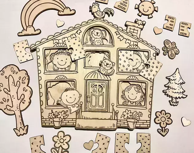 Create a charming wooden house puzzle for kids with this layered laser cut file set. This digital download includes a three-layer design: the base house frame, a middle layer with children and animals, and a top layer with opening shutters and door elements.