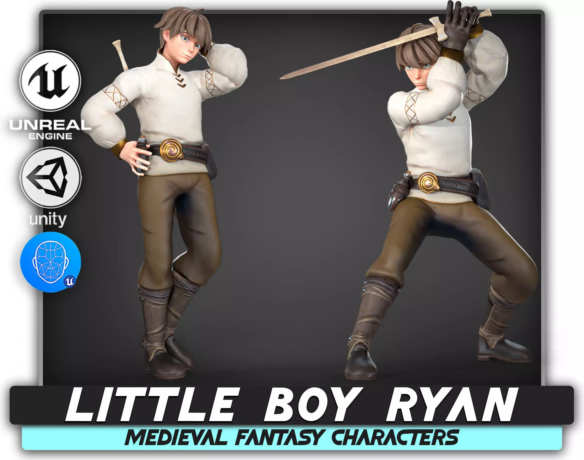 Meet Ryan, the Warrior BoyRyan is a brave boy and young warrior from a fantasy land full of magic. Even though he’s still a child and just a teenager, he carries a powerful sword and dreams of becoming a great hero. Ryan loves adventure, battles, and protecting people. He lives in an epic and medieval world, much like in an RPG or DND game.