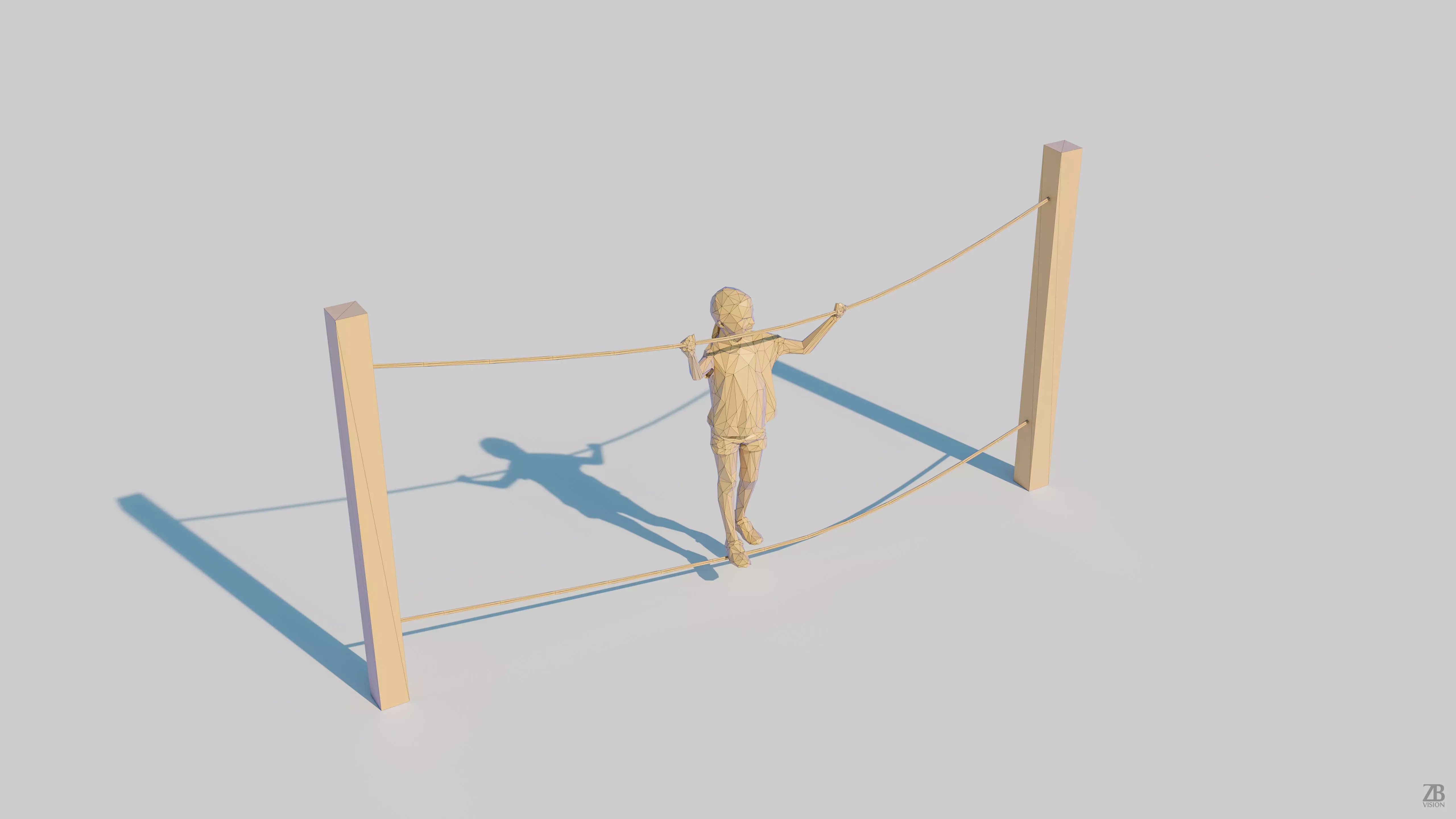 This is a low poly 3d model of a child walking on a rope playground. The low-poly kid was modeled and prepared for low-poly style renderings, background crowd, and general CG visualization. The 3d kid is ready to be inserted in your scene out of the box.