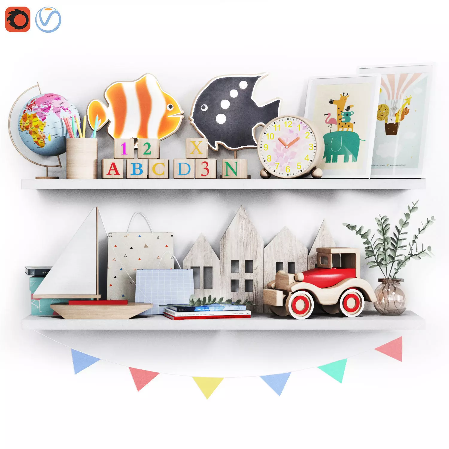 The model has material settings that define how surfaces look (color, shine, transparency, etc.).