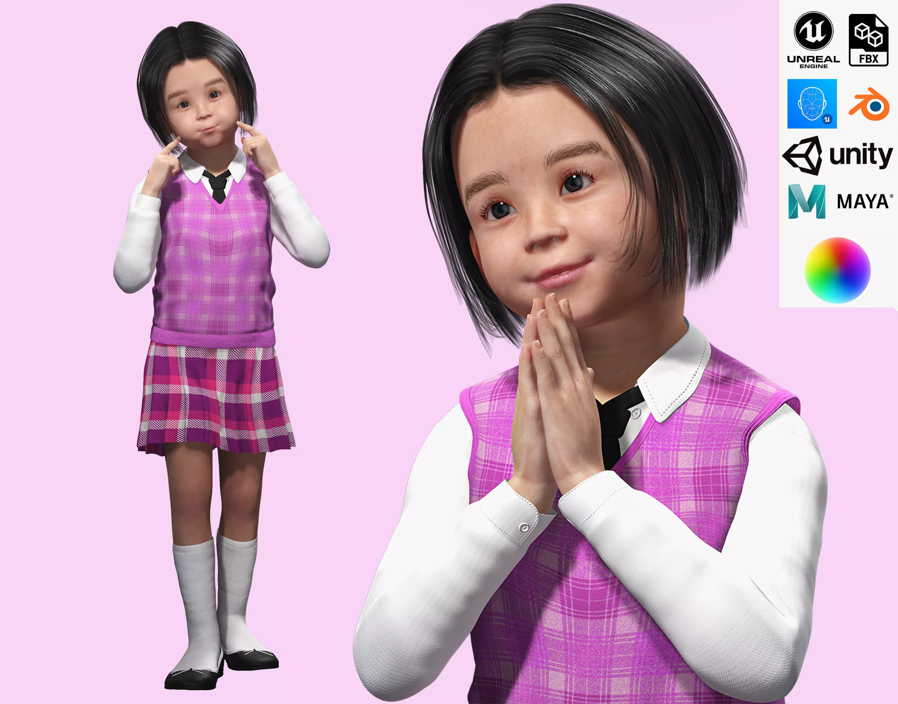 The model is fully customizable, with modular materials that can be adjusted to your liking, including settings for base color, AO, blend, displacement, glow, metallic, UV, normal, opacity, ORM, roughness, and specular. With more than six materials, including those for the eyes, nails, arms, and body, you have complete control over the look and feel of your character.