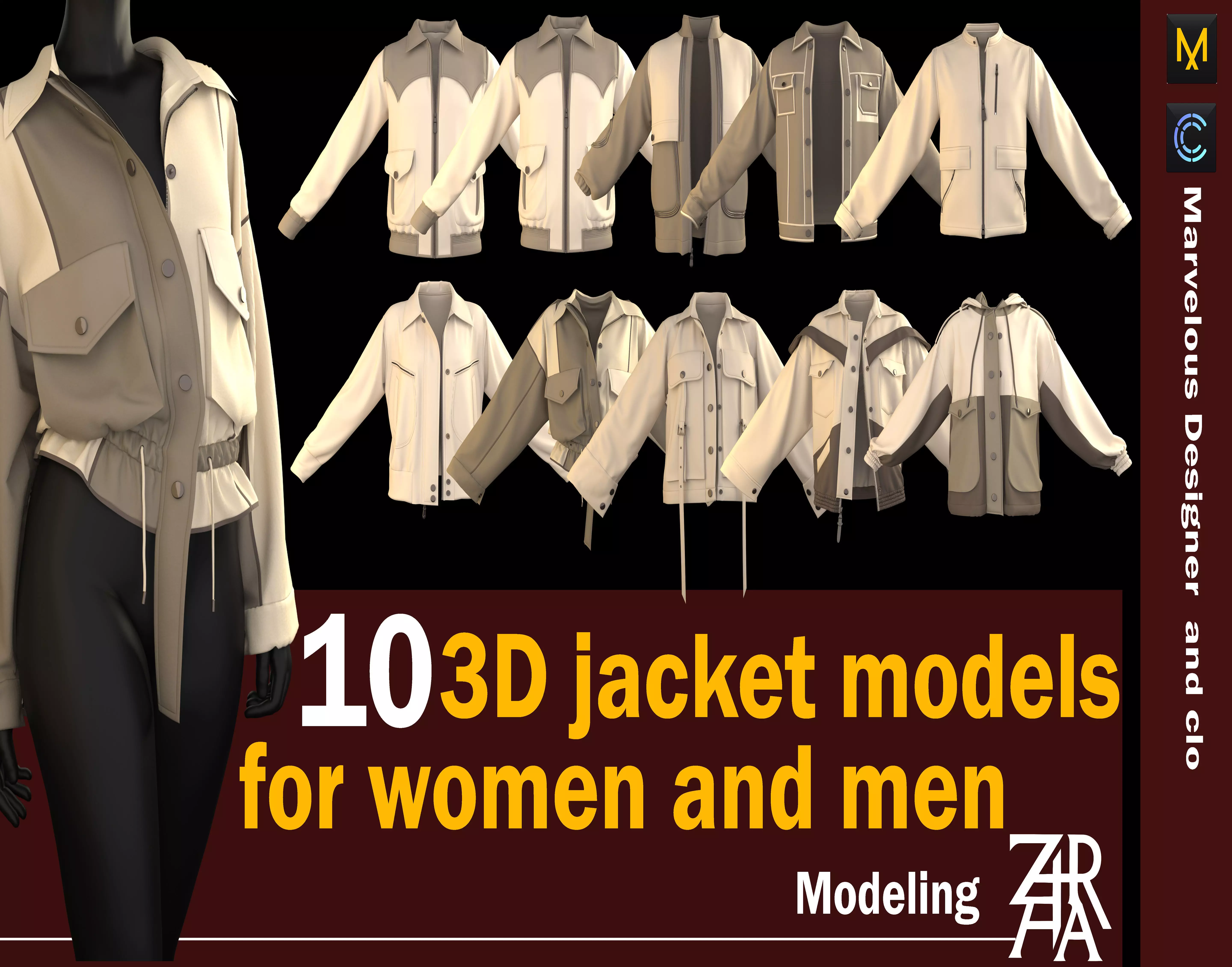 This jacket pack includes 10 high-quality 3D models for men and women designed in Marvelous Designer with clean quad mesh and ready-to-use UVs.
