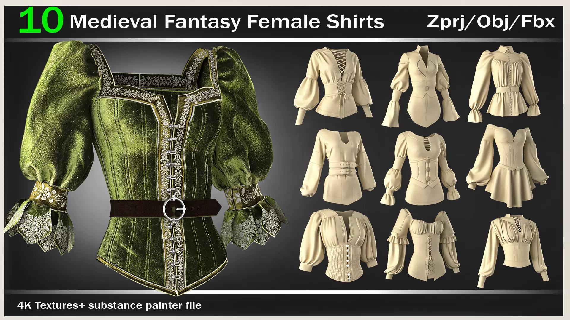 10 Medieval Fantasy Female Shirts – 3D Clothing PackBring your characters to life with this collection of 10 highly detailed medieval-inspired female blouses, perfect for fantasy worlds, stylized RPG characters, or concept art.