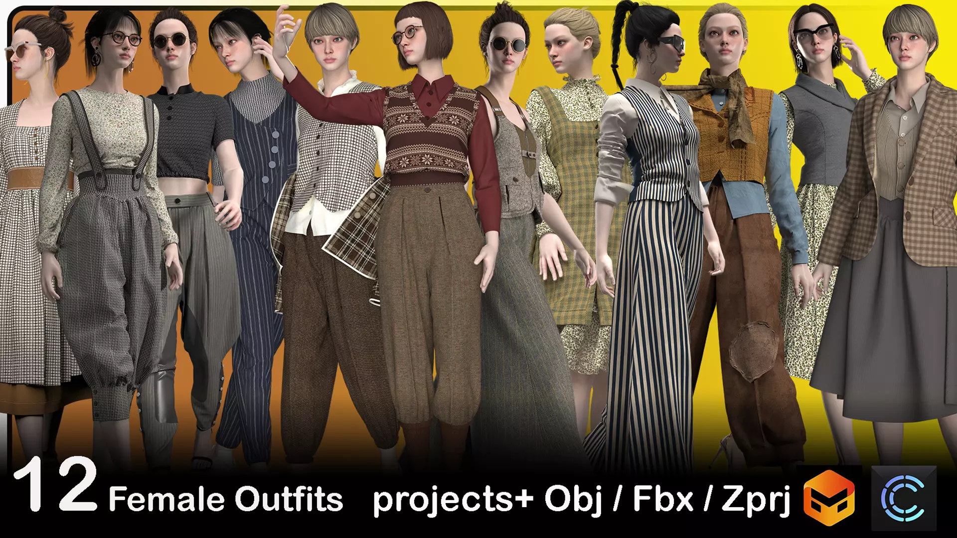 12 Female outfits Marvelous designer / Clo3D Project (ZPRJ+FBX+OBJ Files)