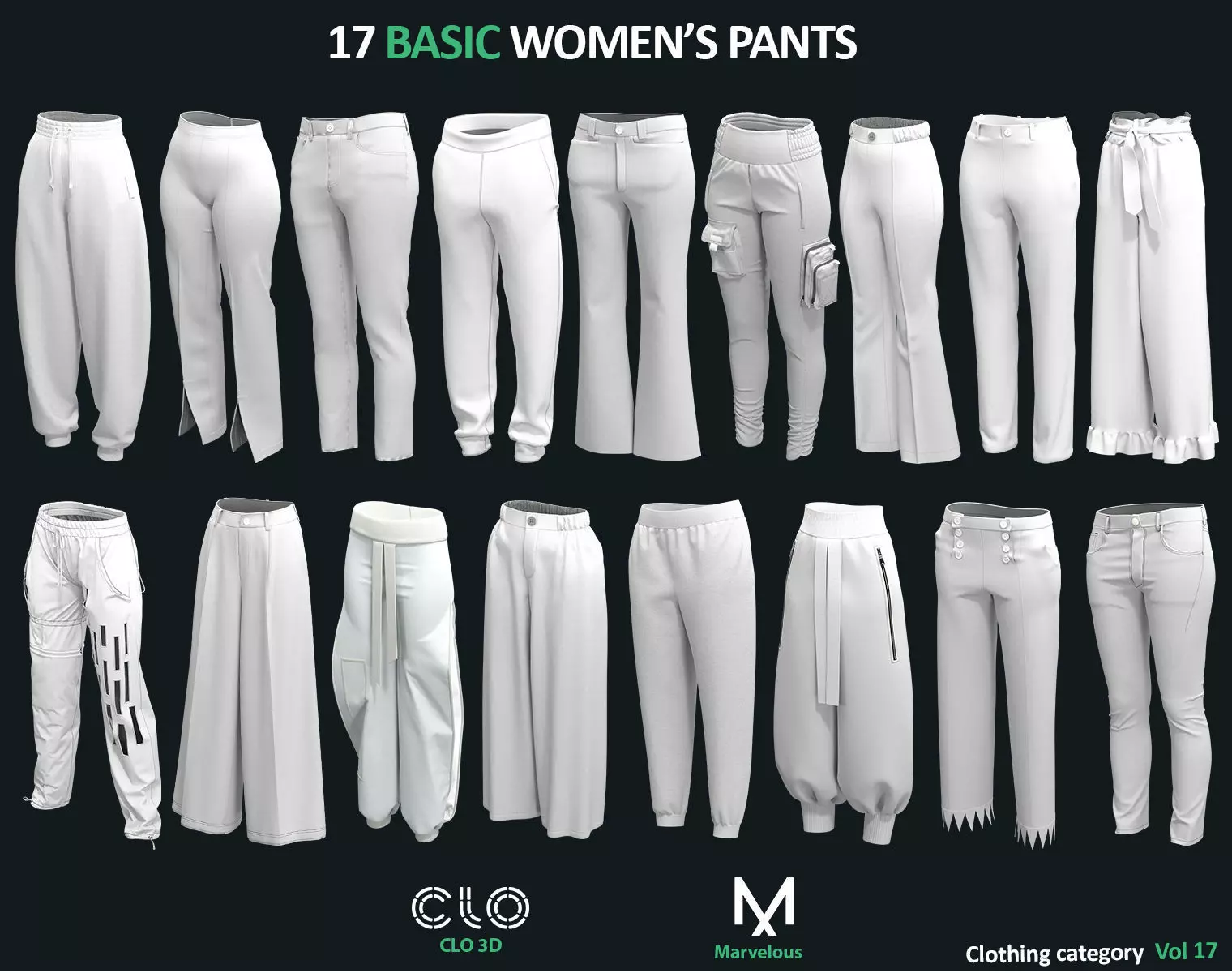 Introducing a collection of 17 women's basic trousers, meticulously designed using Marvelous cutting-edge software for 3D modeling. These trousers have been crafted to seamlessly integrate into various three-dimensional projects, offering both style and functionality. Marulo's advanced design tools have been employed to ensure precision in every detail of these trousers, from stitching patterns to fabric draping. With their versatile design, these 3D trousers are poised to become an essential component for a wide range of 3D projects, including fashion showcases, virtual simulations, and creative visualizations. Elevate your projects with these impeccably designed, Marvelous-powered 3D women's basic trousers that epitomize innovation in virtual garment design.