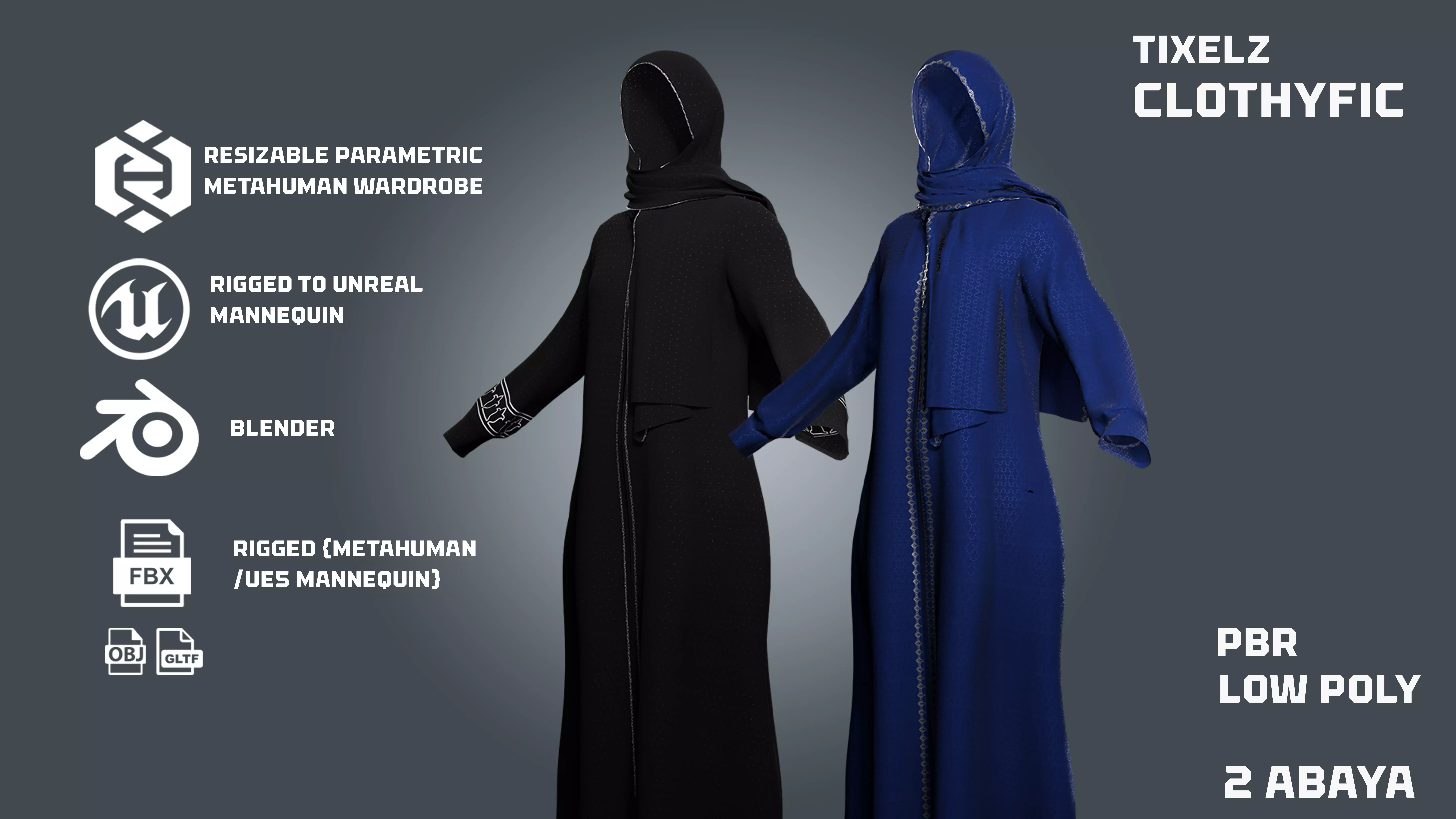 This asset pack includes two detailed Abaya outfits designed for use in Unreal Engine Metahuman and Blender. Each Abaya is fully rigged, PBR-ready, and optimized for both real-time and cinematic use.