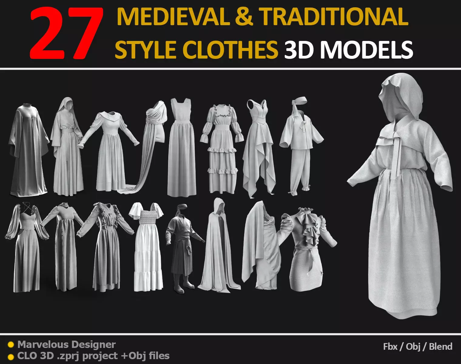 Save Time and Effort: Instantly access a wide range of historical clothing designs, eliminating the need for time-consuming modeling.Enhance Creativity: With a rich variety of outfits, you can create captivating and authentic characters that stand out.Add Realism: High-quality, detailed models that enhance the authenticity and appeal of your projects.Elevate your 3D creations and immerse your audience in the rich history with our 27 Medieval and Traditional Style Clothes 3D Models Pack. Don't miss out on this essential addition to your 3D asset library