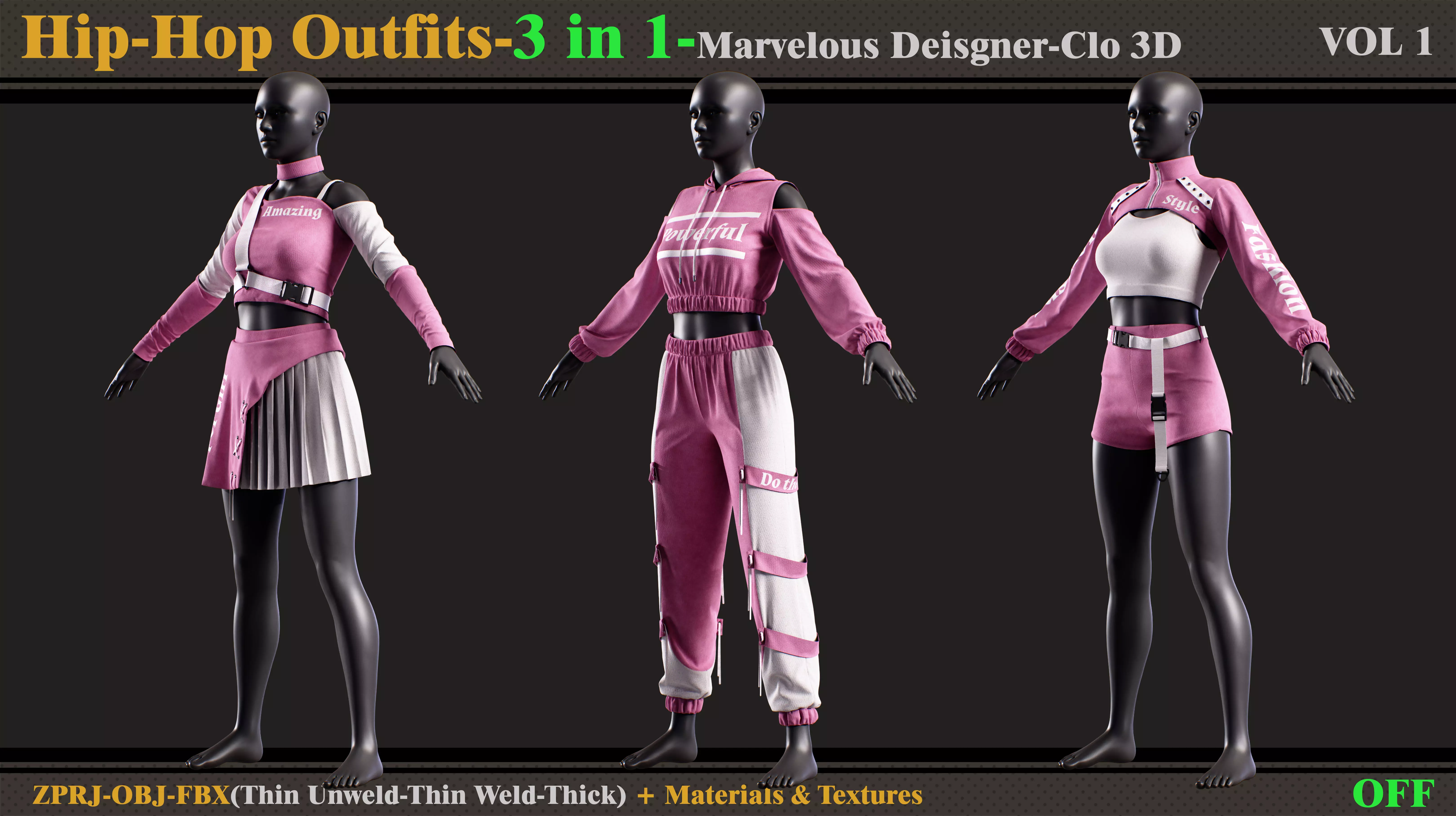 3 in 1 Hip-Hop Outfit-MD-Clo3d-OBJ-FBX-Material-Textures 3D model