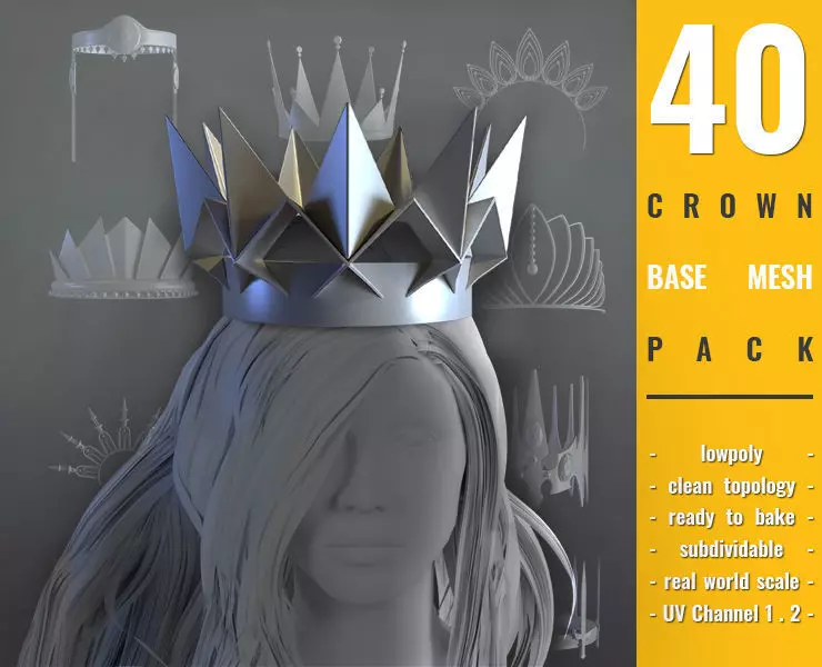 With this collection, you have 40 Crown as base mesh .These models have a clean geometry .All models have 2 UV channels .All crowns are low poly Ready to use for any visual production - broadcast, high-res film close-ups, advertising, games, design visualization, forensic presentation, etc .Using this product will save you a lot of time .(Ready to render exactly as you see above)