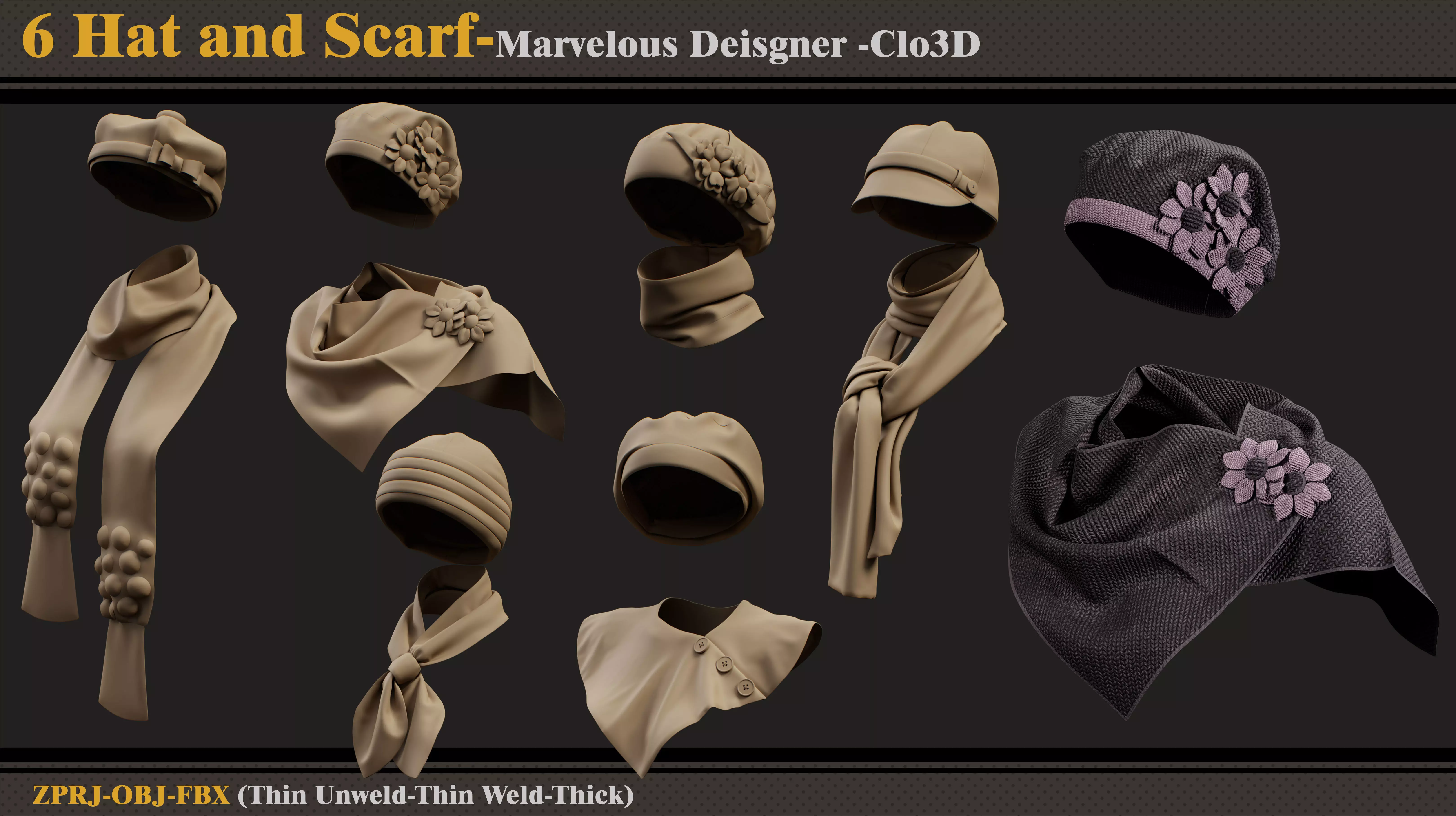 6 Women Hats and Scarfs-MD-CLo3D-ZPRJ-FBX-OBJ 3D model