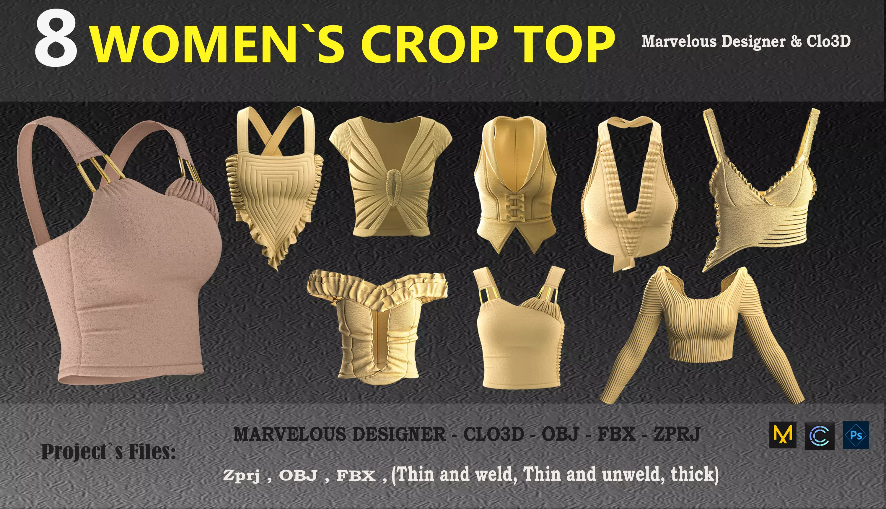 Marvelous designerProject. Made in Clo3d 7.0 models is available in the ( obj, fbx, zprj , png, uv ) files. the product comes with texture and normal map. the product is Quad mesh and particle distance in marvelous designer and clo3d is set on3. this product is designed in clo3D and text rendered in clo3D. overlapping UV.