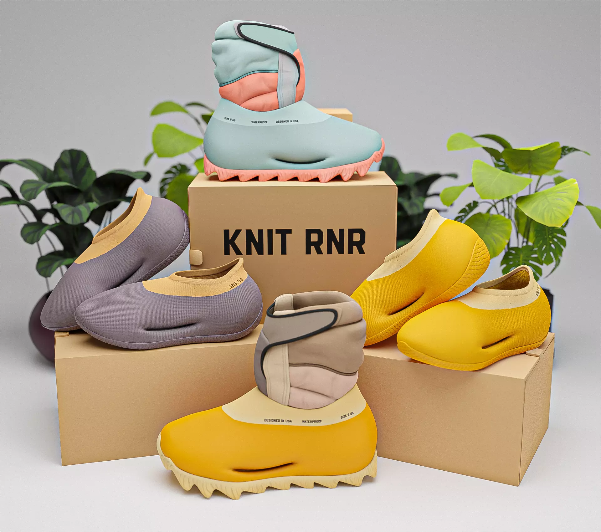 Adidas Yeezy Knit RNR [Low and High]. Color - yellow \ pink-blue \ gray \ purple. !!! 2 PACK OF TEXTURES. CHECK PHOTO !!! 4k textures. No extra plugins are required for this model. Lights and cameras are not included in the scene.