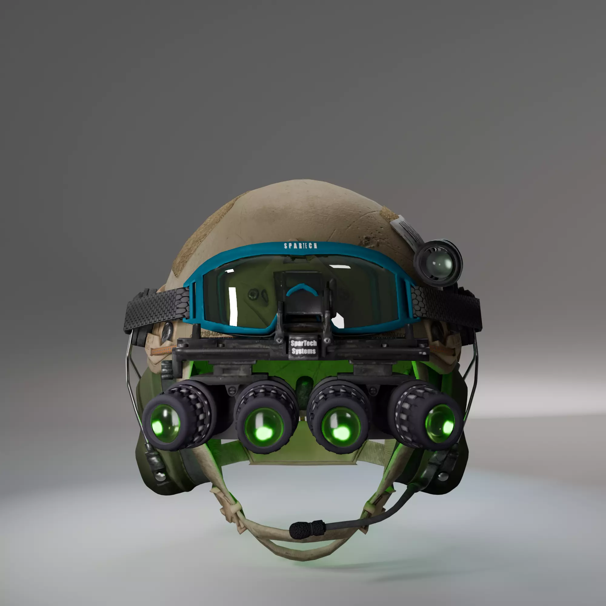 This highly detailed 3D model features a modern combat helmet equipped with advanced tactical gear, ideal for military characters or futuristic settings. The helmet's realistic design and high-quality textures make it a versatile asset for various projects.
