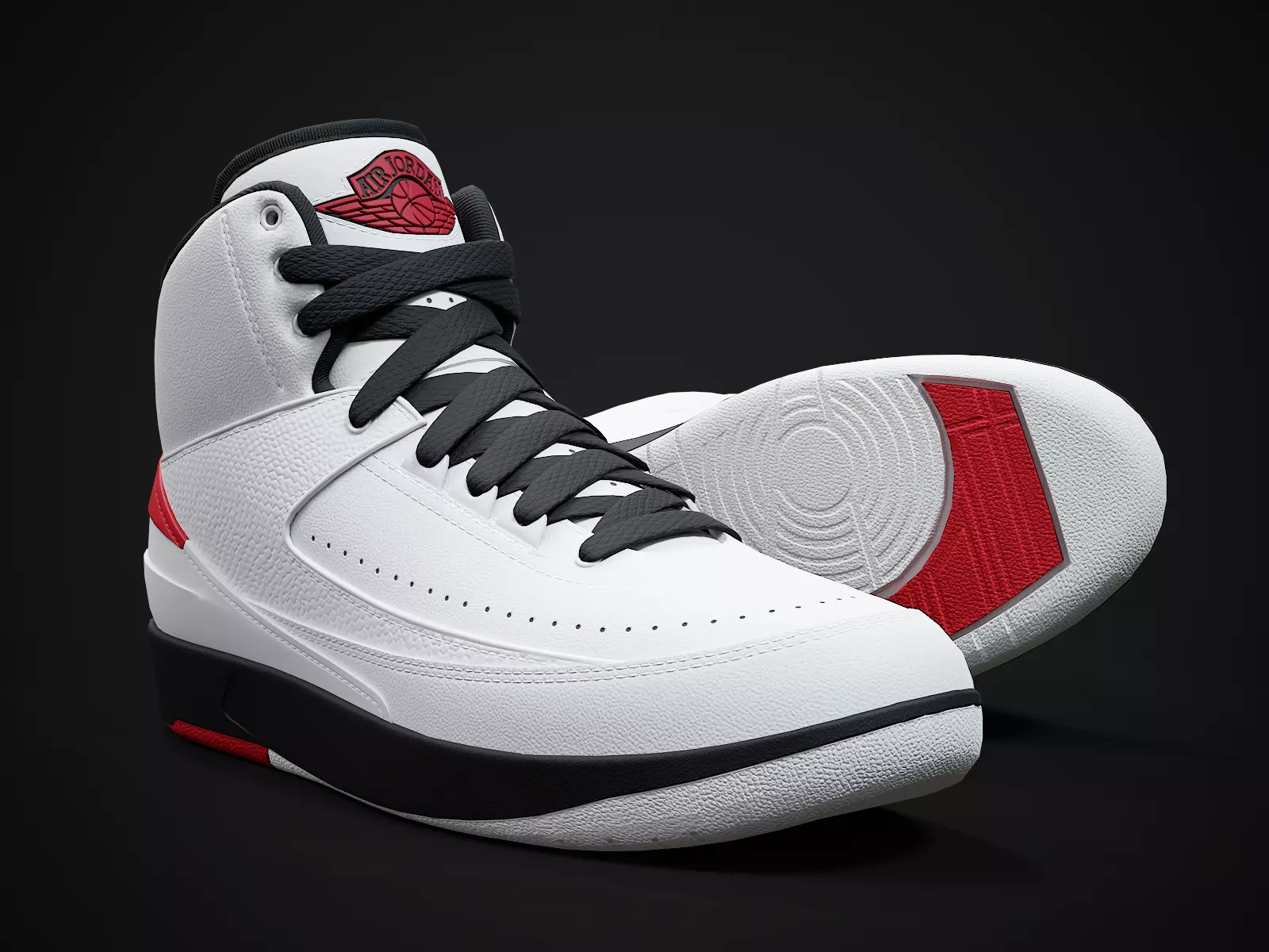 Medium poly PBR textured model of Air Jordan 2-retro sneaker (Chicago 2022 colorway). Well textured and ready for Virtual Reality (VR), Augmented Reality (AR), games and other real-time apps for handheld devices.