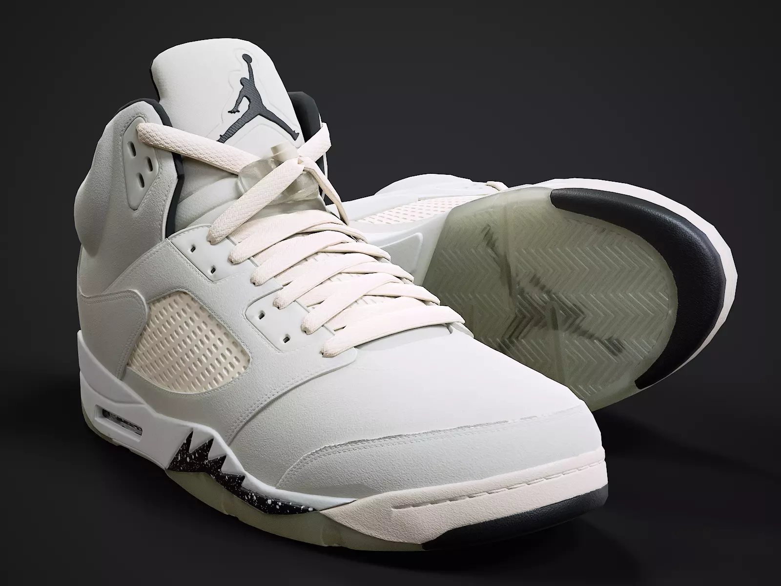 Medium poly PBR textured model of Air Jordan 5-retro sneaker (SE-Sail colorway). Well textured and ready for Virtual Reality (VR), Augmented Reality (AR), games and other real-time apps for handheld devices.