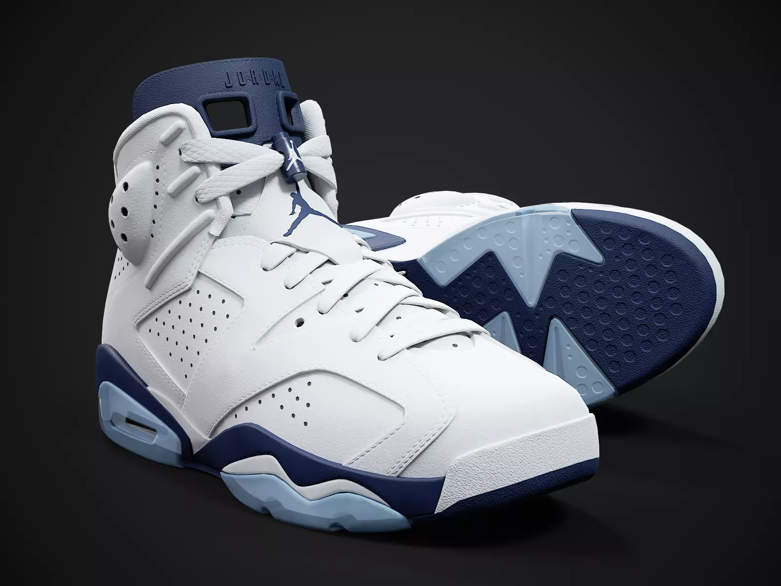Medium poly PBR textured model of Air Jordan 6-retro sneaker (Midnight Navy colorway). Well textured and ready for Virtual Reality (VR), Augmented Reality (AR), games and other real-time apps for handheld devices.