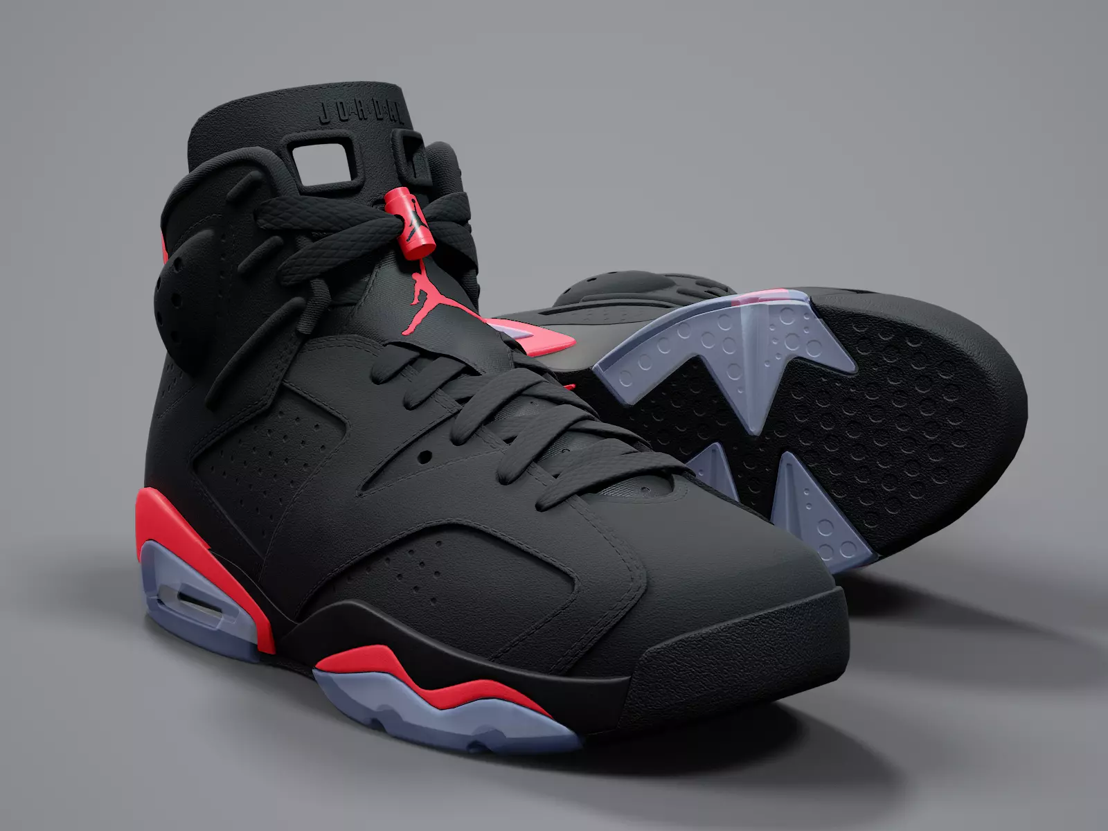 Medium poly PBR textured model of Air Jordan 6-retro sneaker (Black-Infrared colorway). Well textured and ready for Virtual Reality (VR), Augmented Reality (AR), games and other real-time apps for handheld devices.