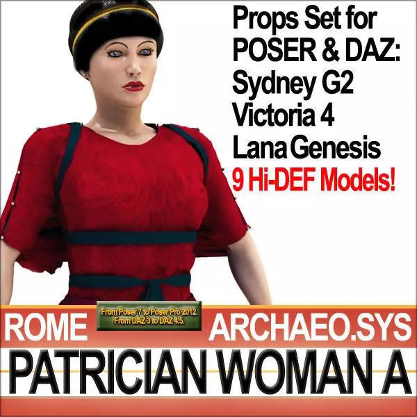 The Ancient Rome Patrician Woman A. 9 HD 3D models for POSER SydneyG2-JessiG2 & DAZ Victoria4-LanaGenesis. 45 textures. Faithful, accurate Reconstruction. C4D, 3DS, OBJ, POSER, DAZ, from VUE6 to 11.