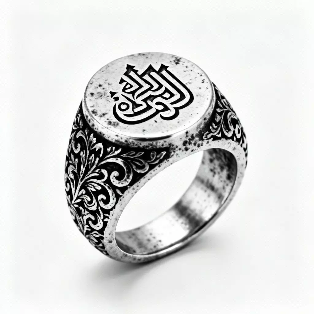 Engraved Calligraphy Face The flat, circular face of the ring does not have a gem. Instead, it features deep, black engraving of Arabic calligraphy. The contrast between the dark sunken letters and the bright silver surface ensures the design is legible and striking.