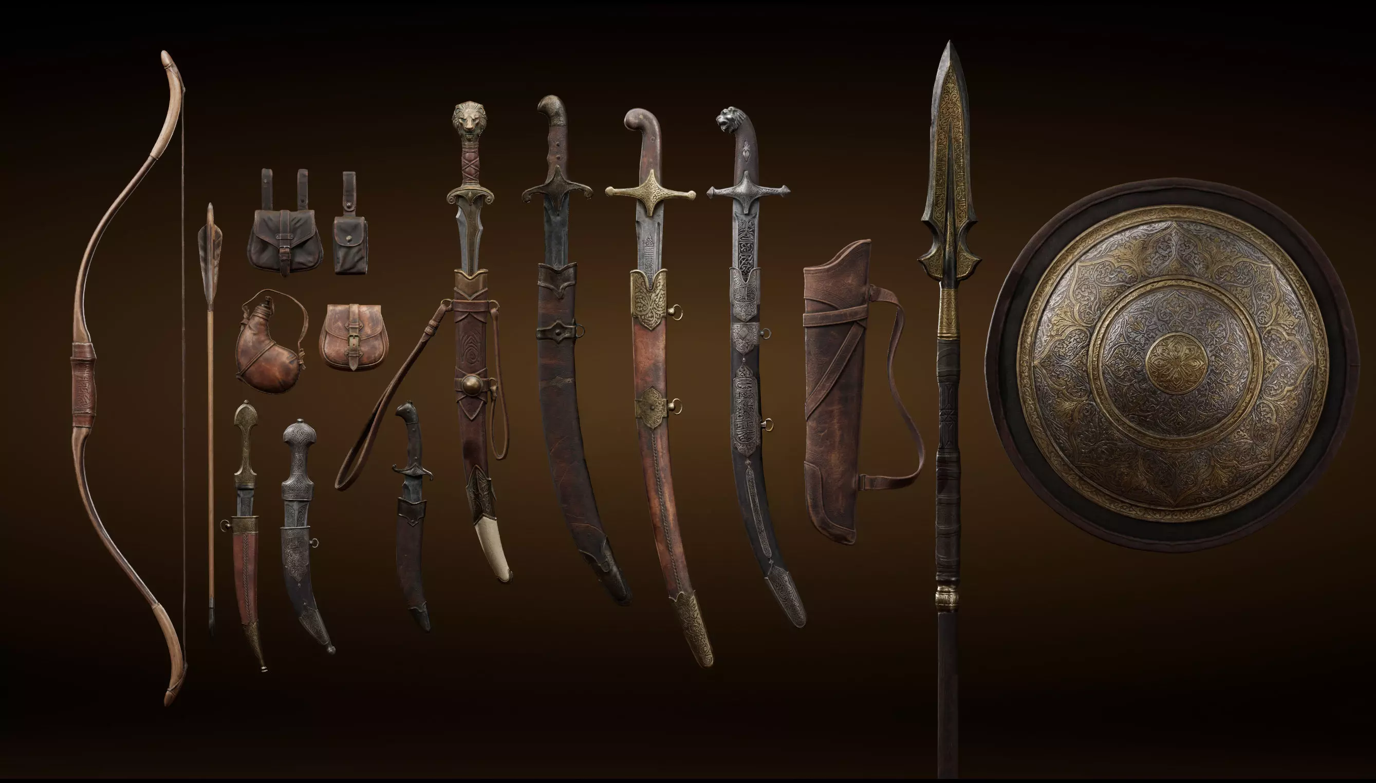 A detailed collection of medieval weapons and character equipment designed for historical and fantasy environments. This pack includes a variety of swords, daggers, a spear, a bow with arrows, a decorated shield, leather pouches, and other character gear.
